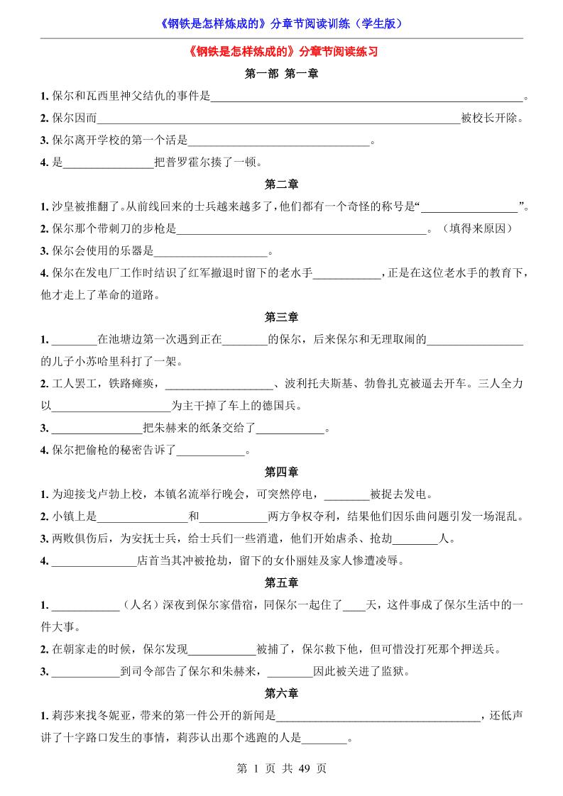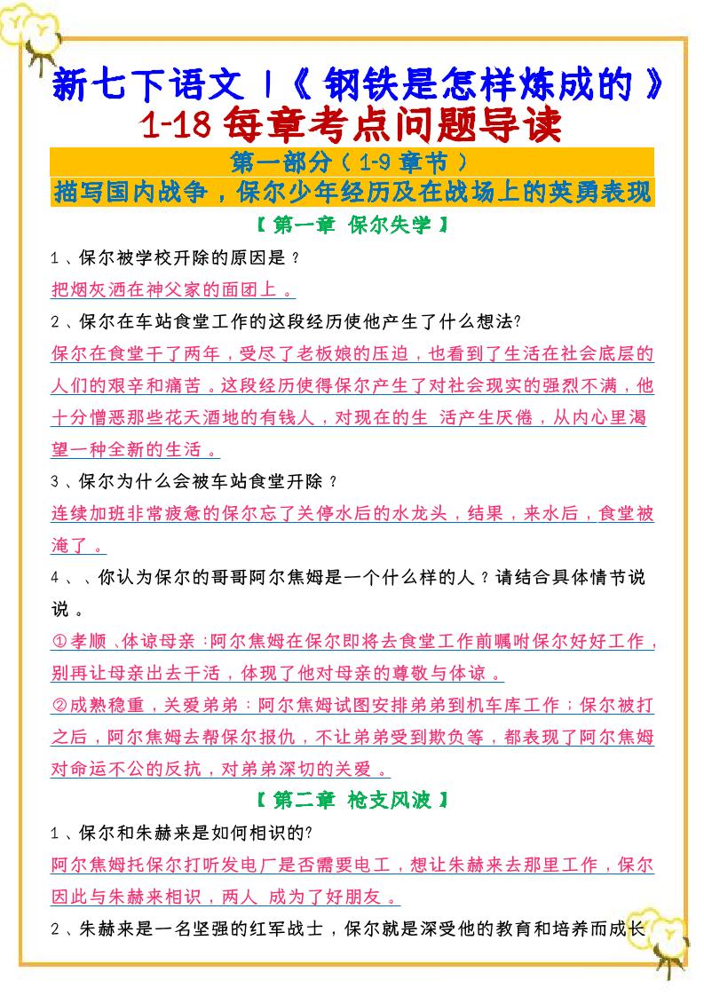 新七下语文《钢铁是怎样炼成的》1-18每章考点问题导读
