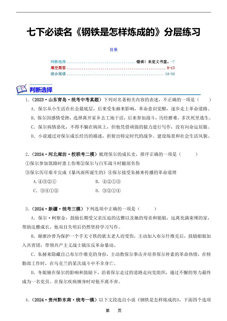 七下名著《钢铁是怎样炼成的》分章节阅读训练