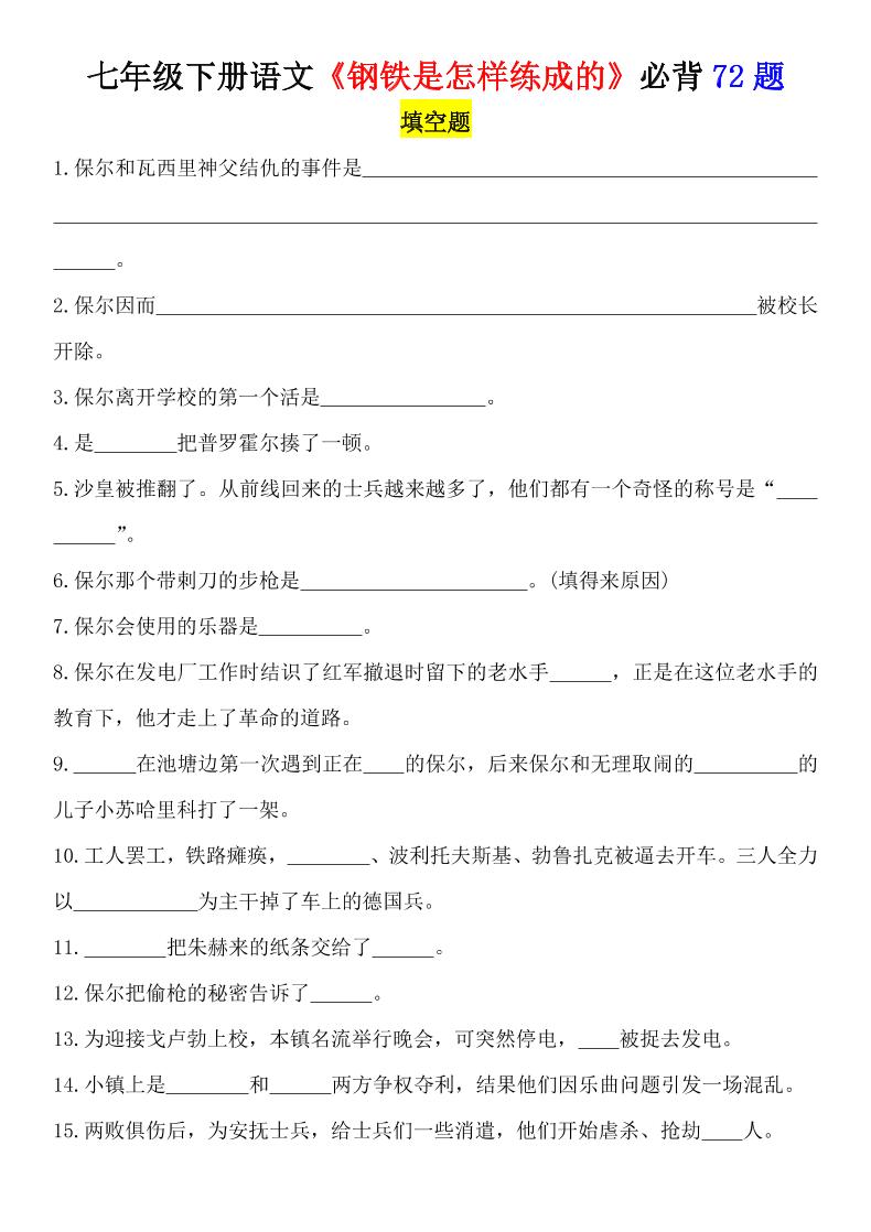 七年级下册语文《钢铁是怎样练成的》必背72题