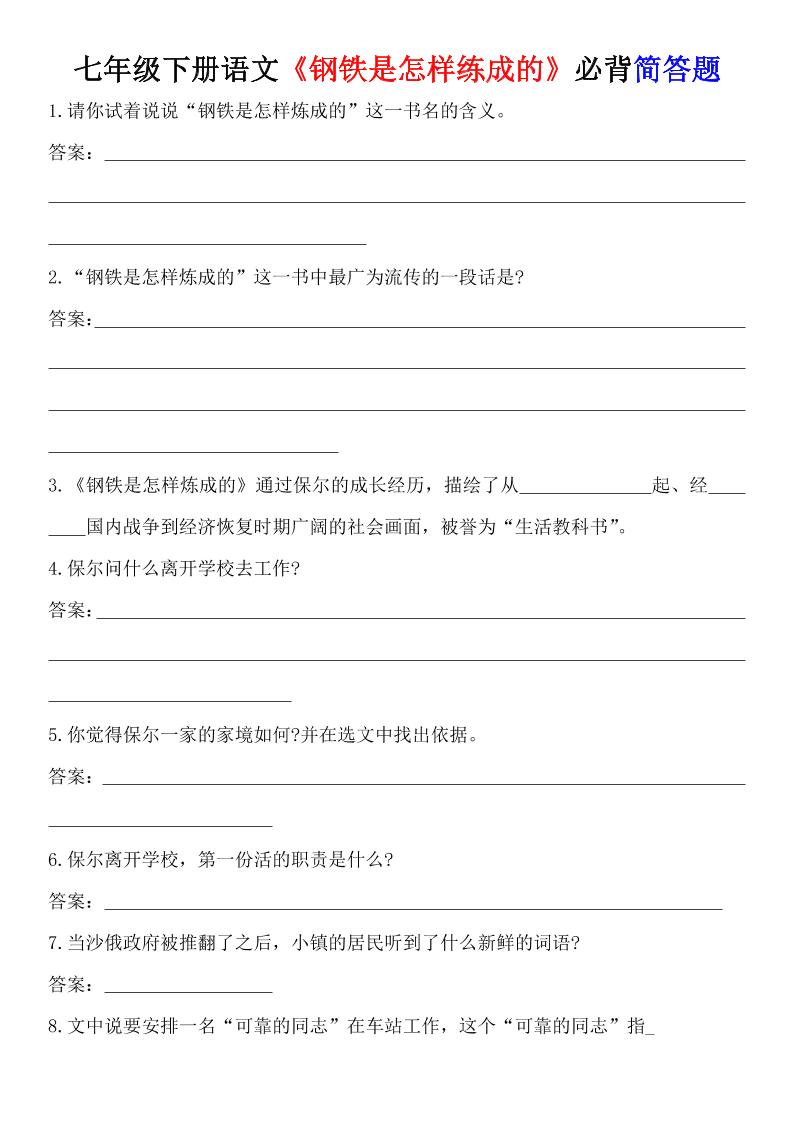 七年级下册语文《钢铁是怎样练成的》必背简答题