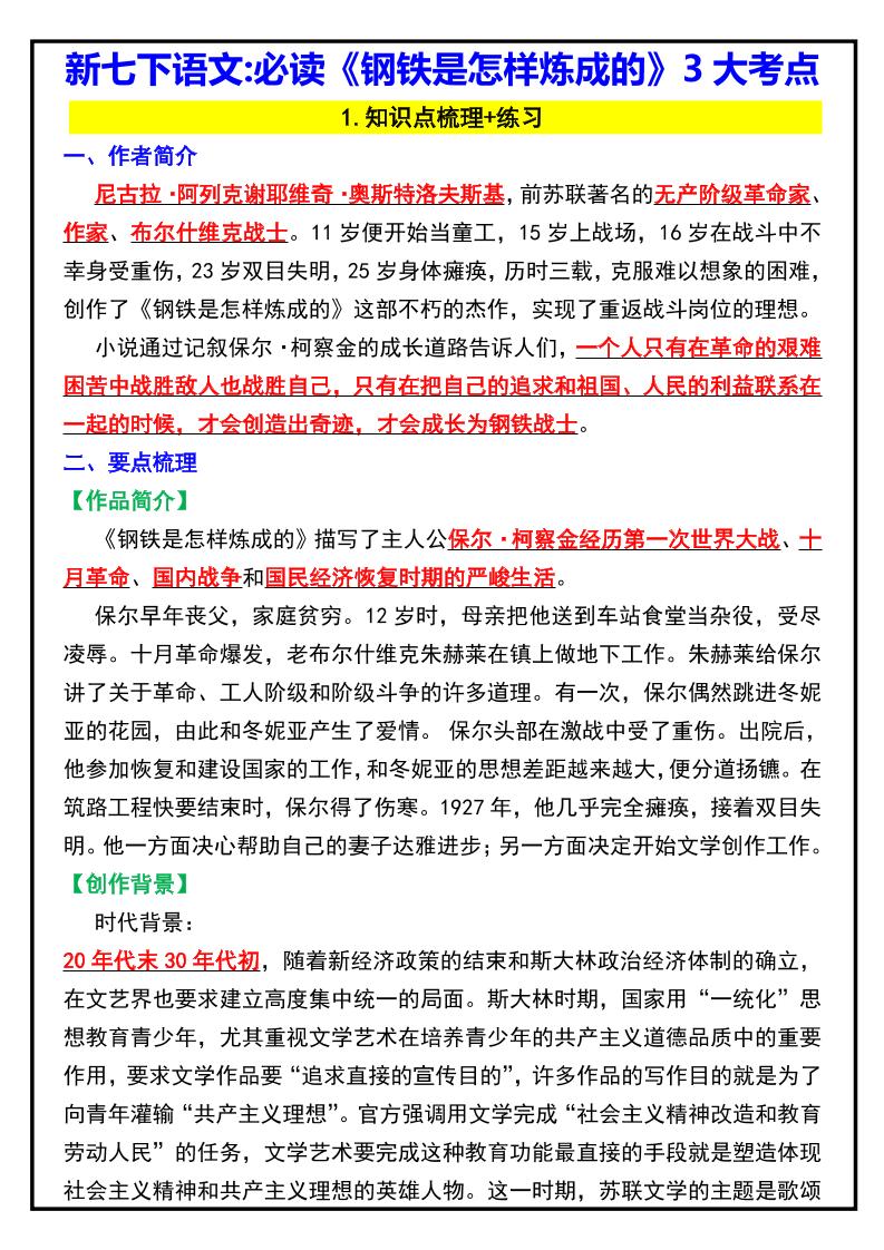 七下语文必读名著《钢铁是怎样炼成的》知识点汇总+考点解析