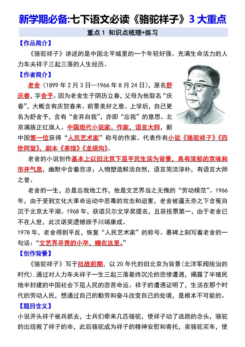新学期必备;七下语文必读《骆驼祥子》3大重点