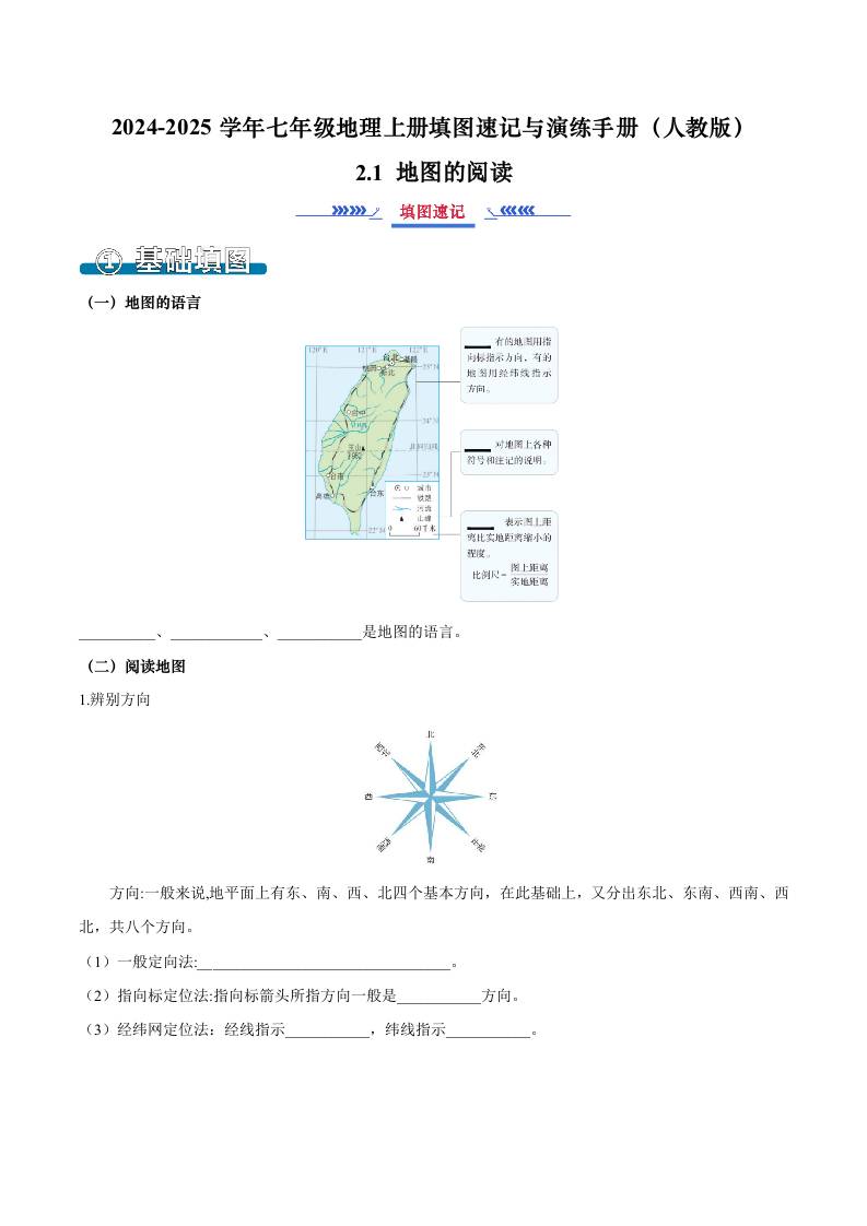 2.1 地图的阅读(填图速记)-2024-2025学年七年级地理上册填图速记与演练手册(人教版2024)(原卷版)