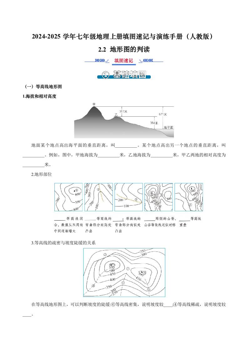 2.2 地形图的判读(填图速记)-2024-2025学年七年级地理上册填图速记与演练手册(人教版2024)(原卷版)