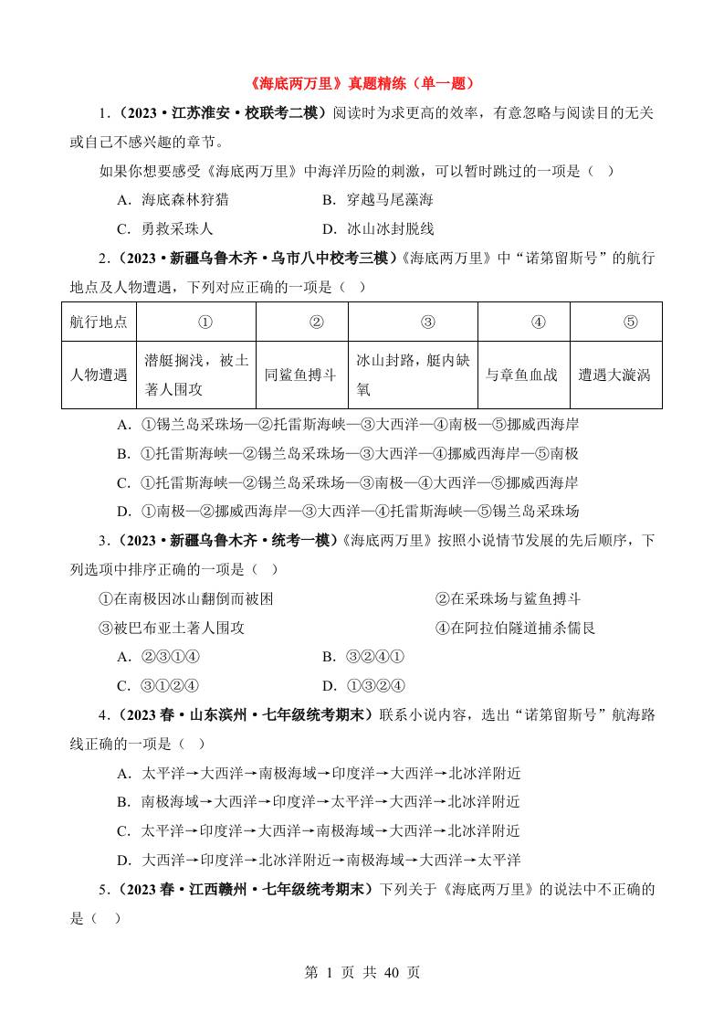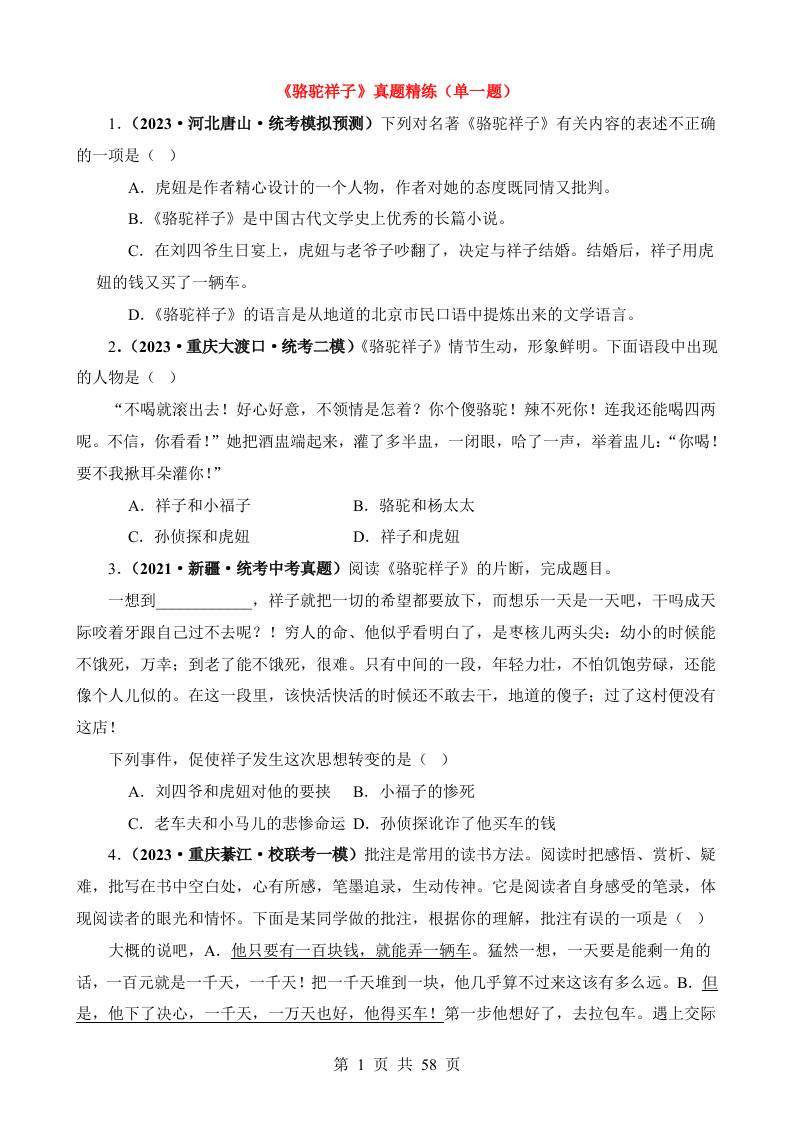 七下必读名著《骆驼祥子》真题精练(单一题)