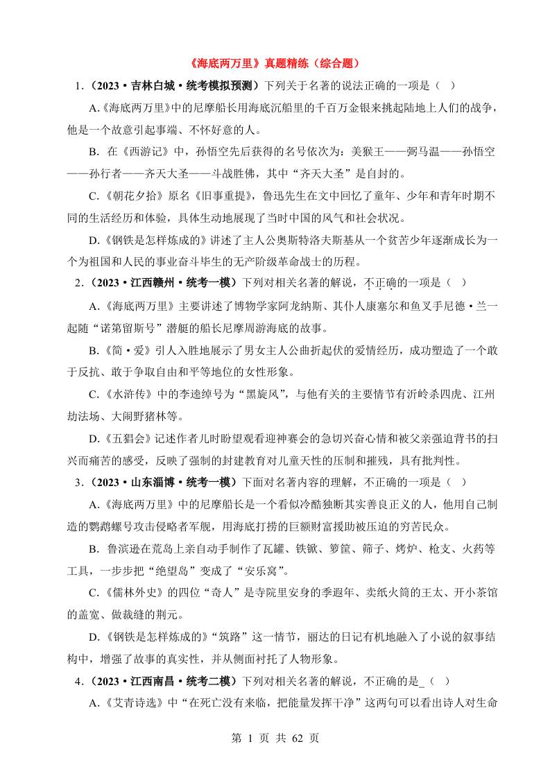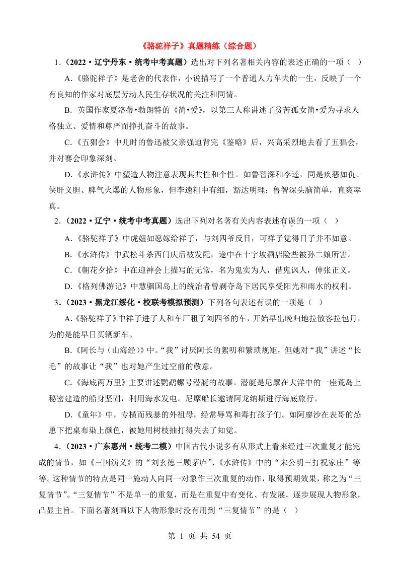 七下必读名著《骆驼祥子》真题精练(综合题)