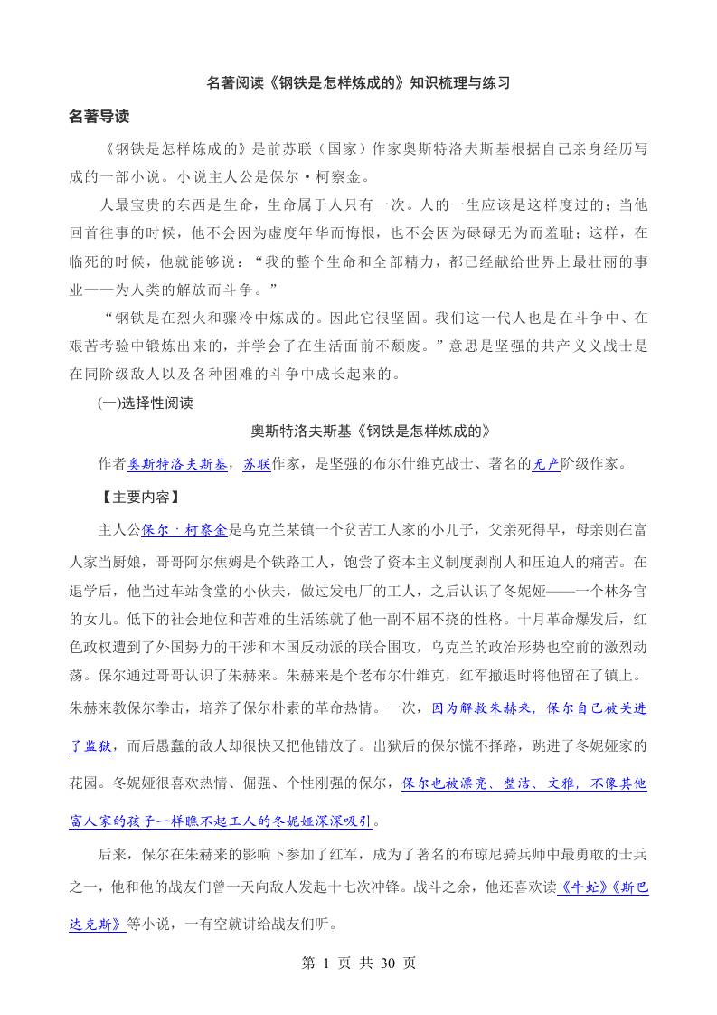 七下必读名著《钢铁是怎样炼成的》知识梳理与练习