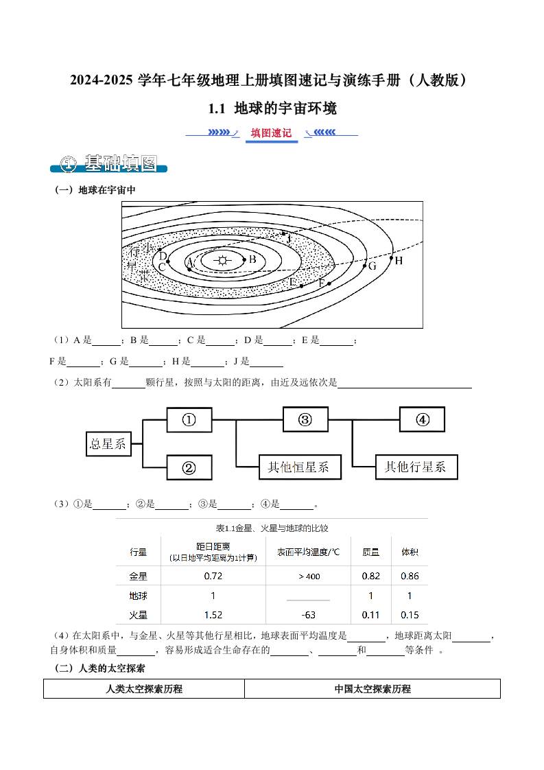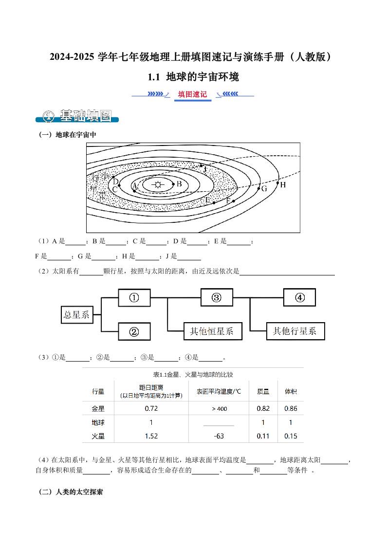 1.1 地球的宇宙环境(填图速记)-2024-2025学年七年级地理上册填图速记与演练手册(人教版2024)(原卷版)