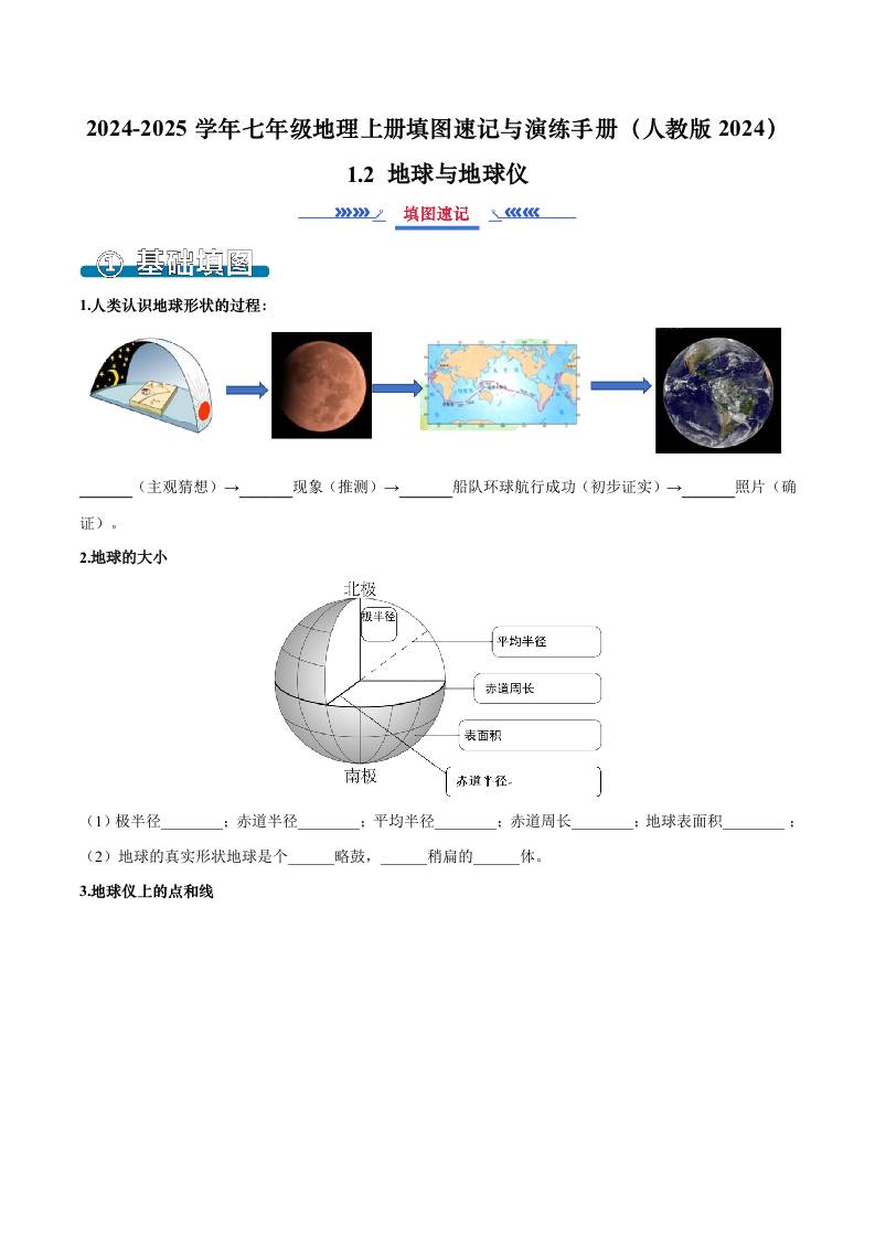 1.2 地球与地球仪-2024-2025学年七年级地理上册填图速记与演练手册(人教版2024)(原卷版)