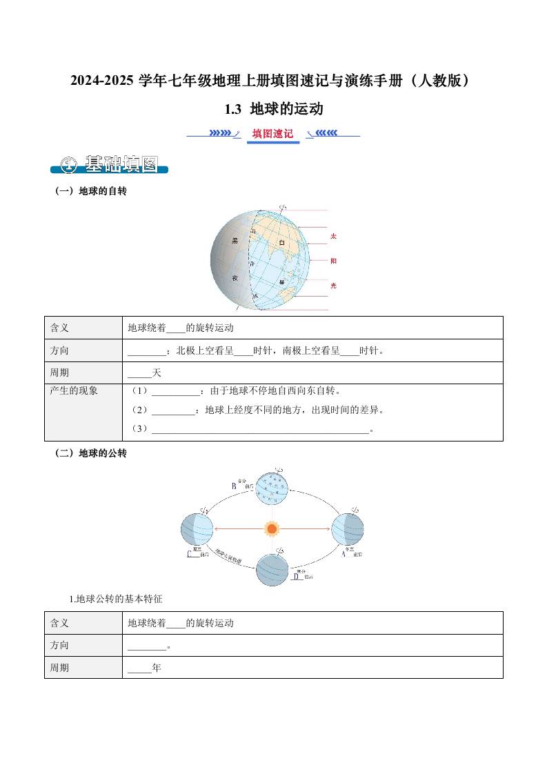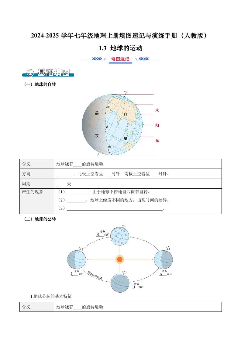 1.3 地球的运动(填图速记)-2024-2025学年七年级地理上册填图速记与演练手册(人教版2024)(原卷版)