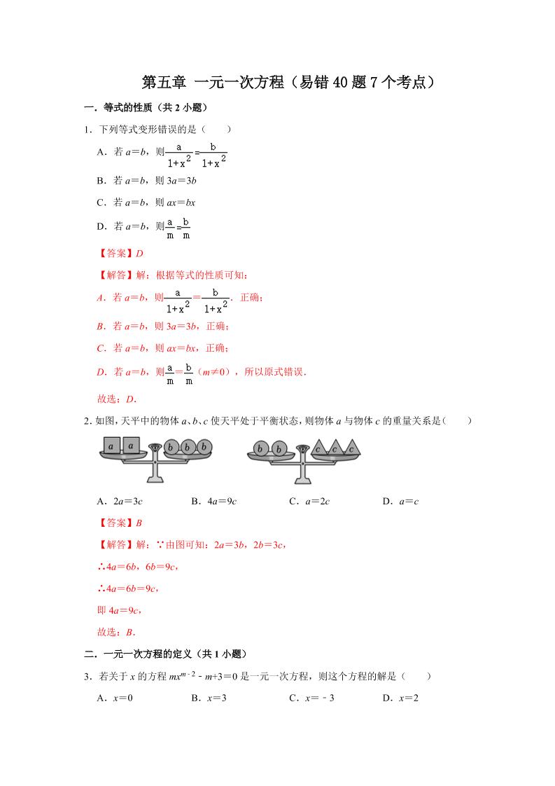 15.第五章 一元一次方程(易错40题7个考点)(解析版)