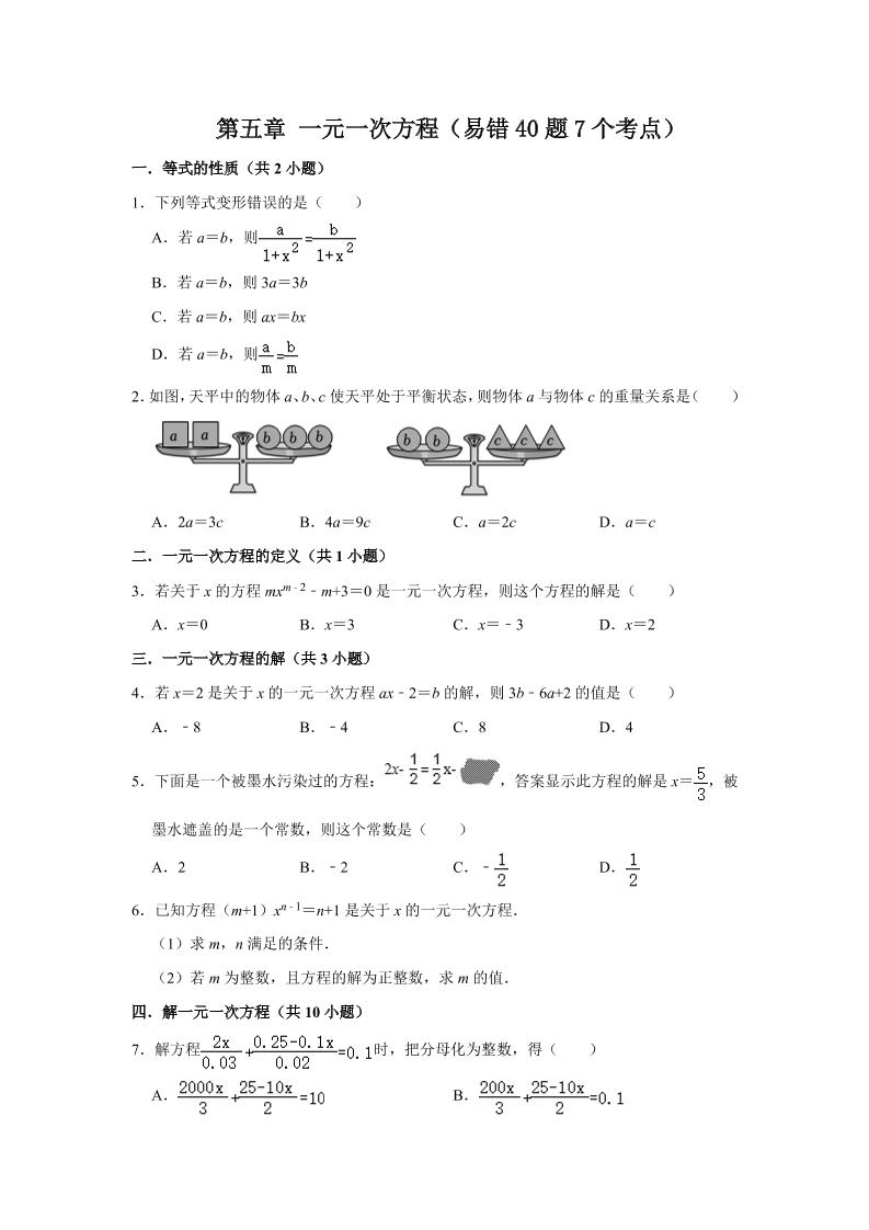 16.第五章 一元一次方程(易错40题7个考点)(原卷版)