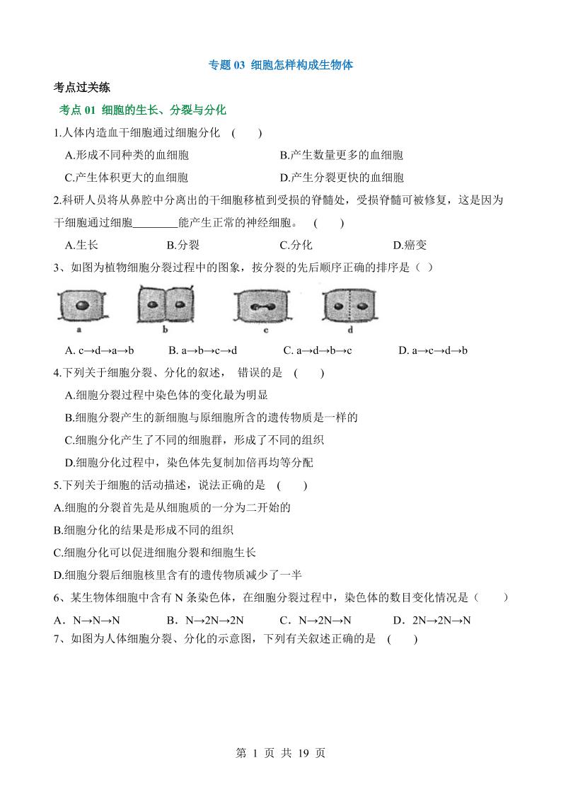 专题03 细胞怎样构成生物体(练习)