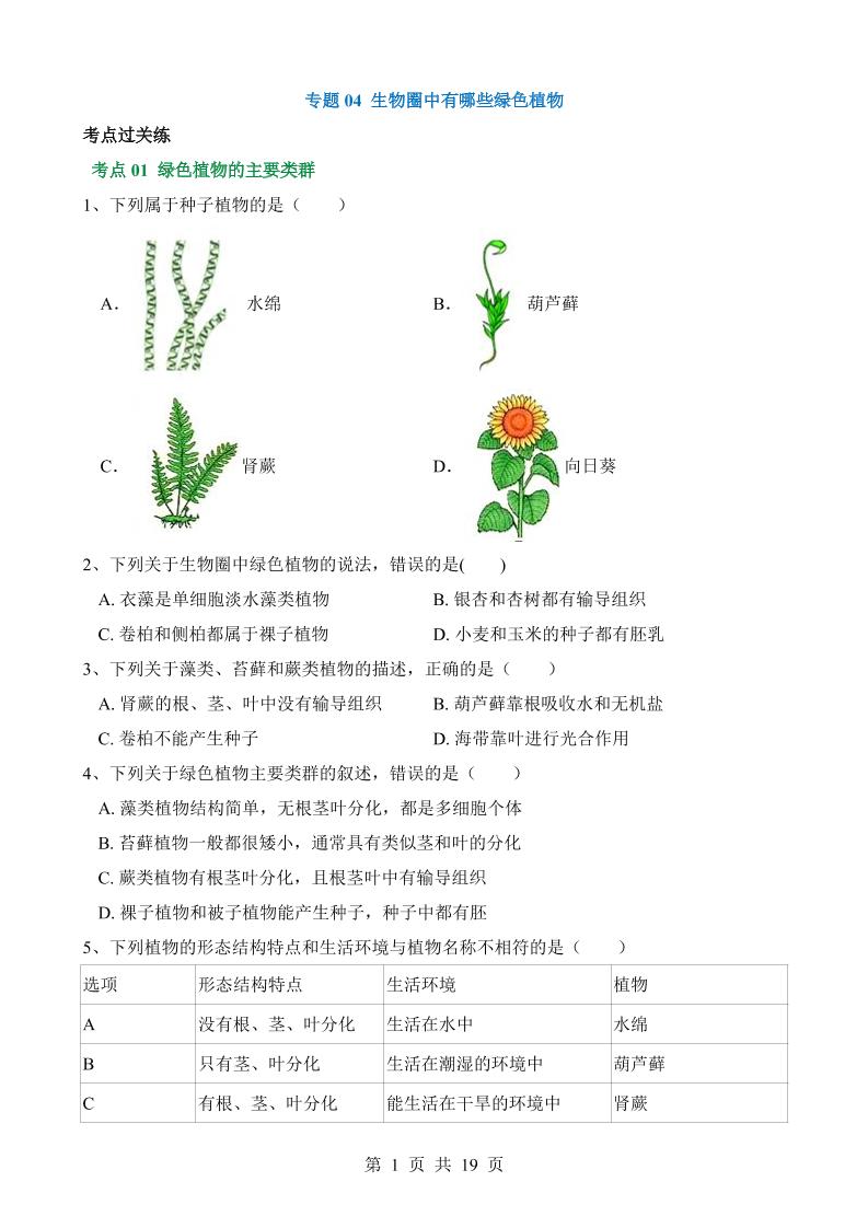 专题04 生物圈中有哪些绿色植物(练习)
