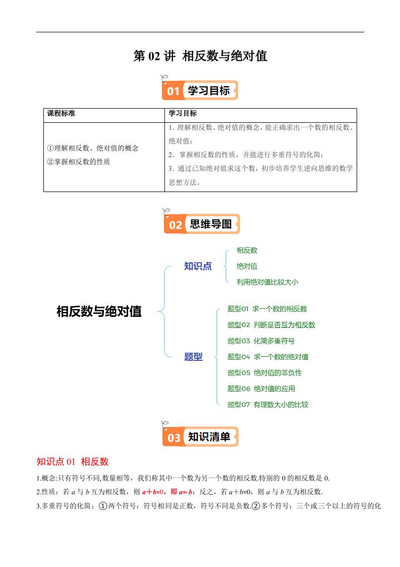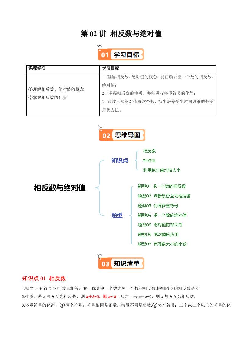 第二章第02讲 相反数与绝对值(原卷版)