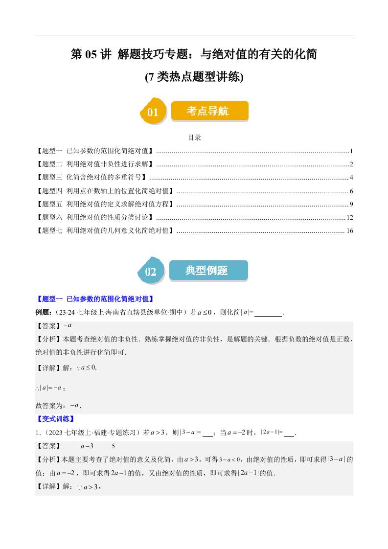 第二章第05讲 解题技巧专题:与绝对值的有关的化简(7类热点题型讲练)(解析版)