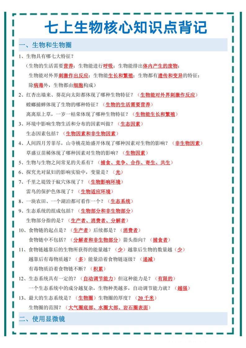 2025年中考生物一轮复习:七上生物核心考点背记提纲(背诵)