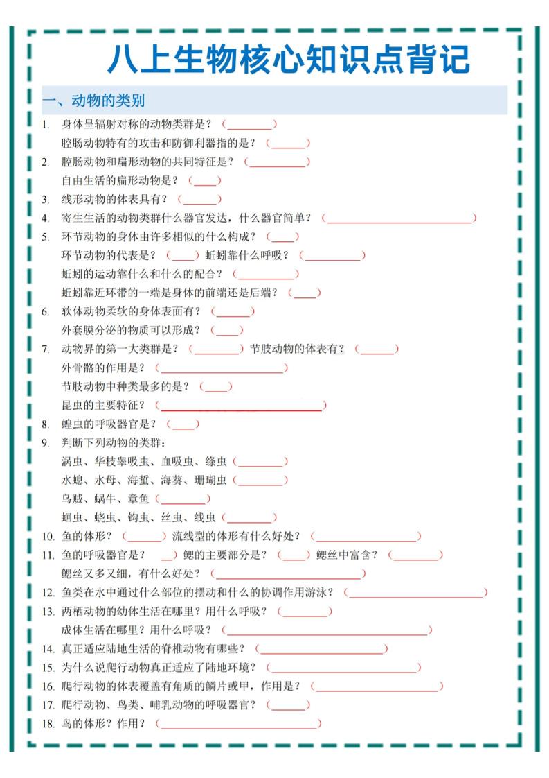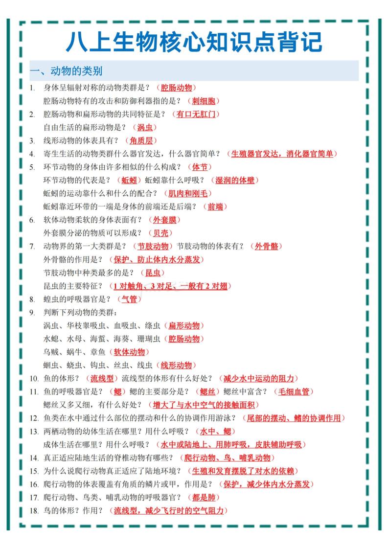 2025年生物中考一轮复习:八上生物核心考点背记提纲(背诵)