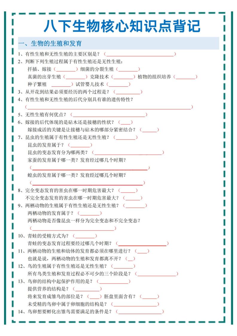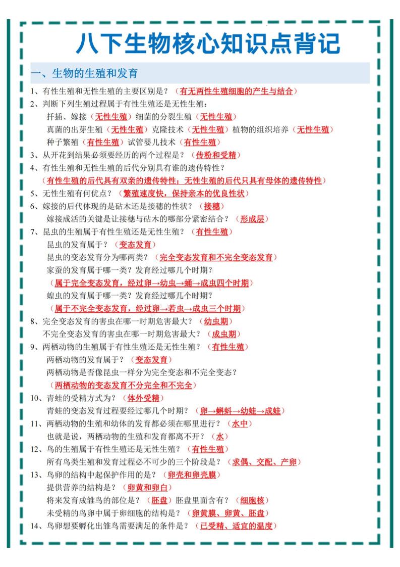 2025年生物中考一轮复习:八下生物核心考点背记提纲(默写)_