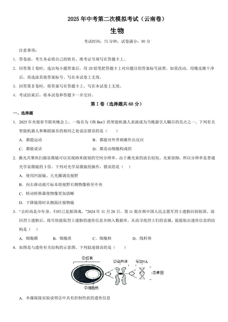 2025年中考第二次模拟生物(云南卷)考试版