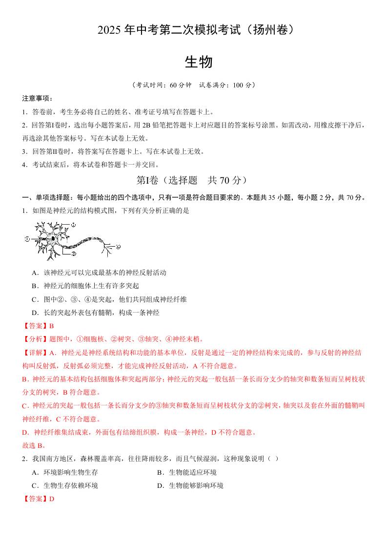 2025年中考第二次模拟生物(扬州卷)(全解全析)