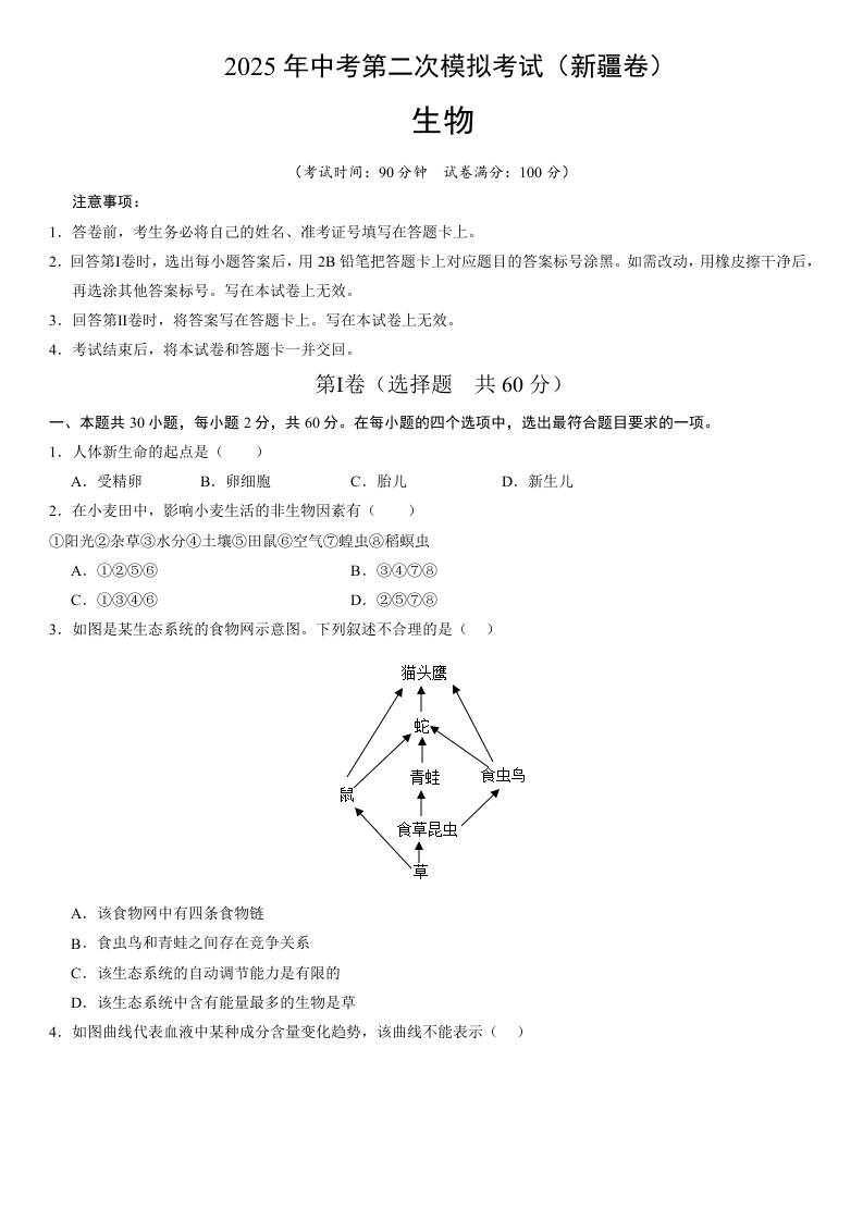 2025年中考第二次模拟生物(新疆卷)(考试版A4)