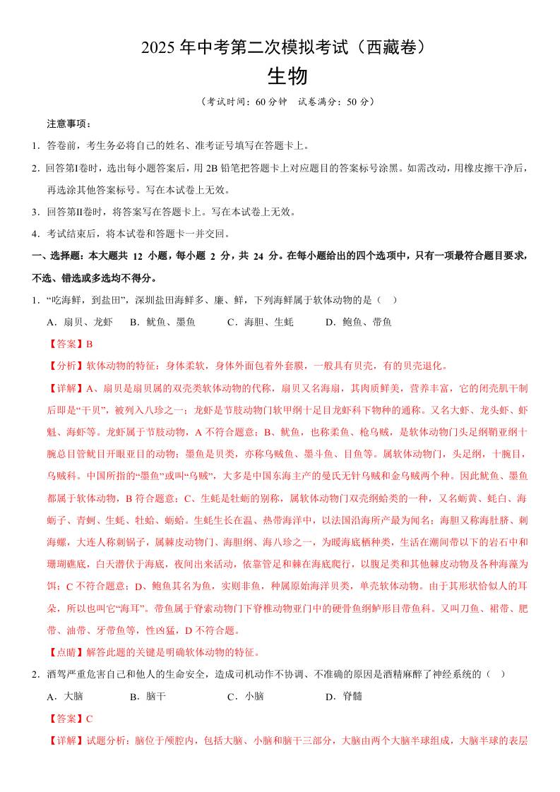 2025年中考第二次模拟生物(西藏卷)(全解全析)