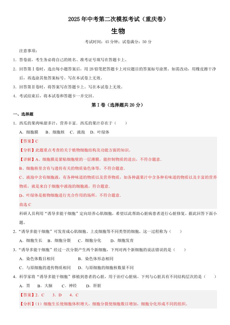 2025年中考第二次模拟生物(重庆卷)全解全析