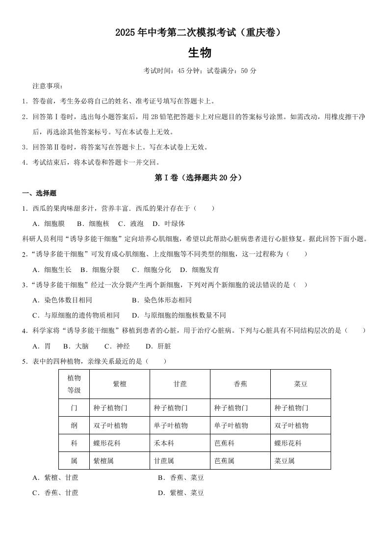 2025年中考第二次模拟生物(重庆卷)考试版