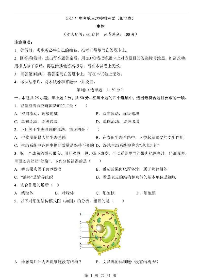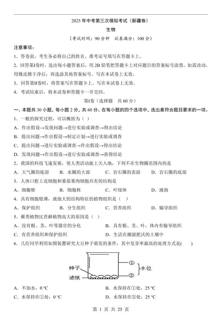 (甘肃卷)2025年生物中考第一次模拟试卷(考试版A4)_