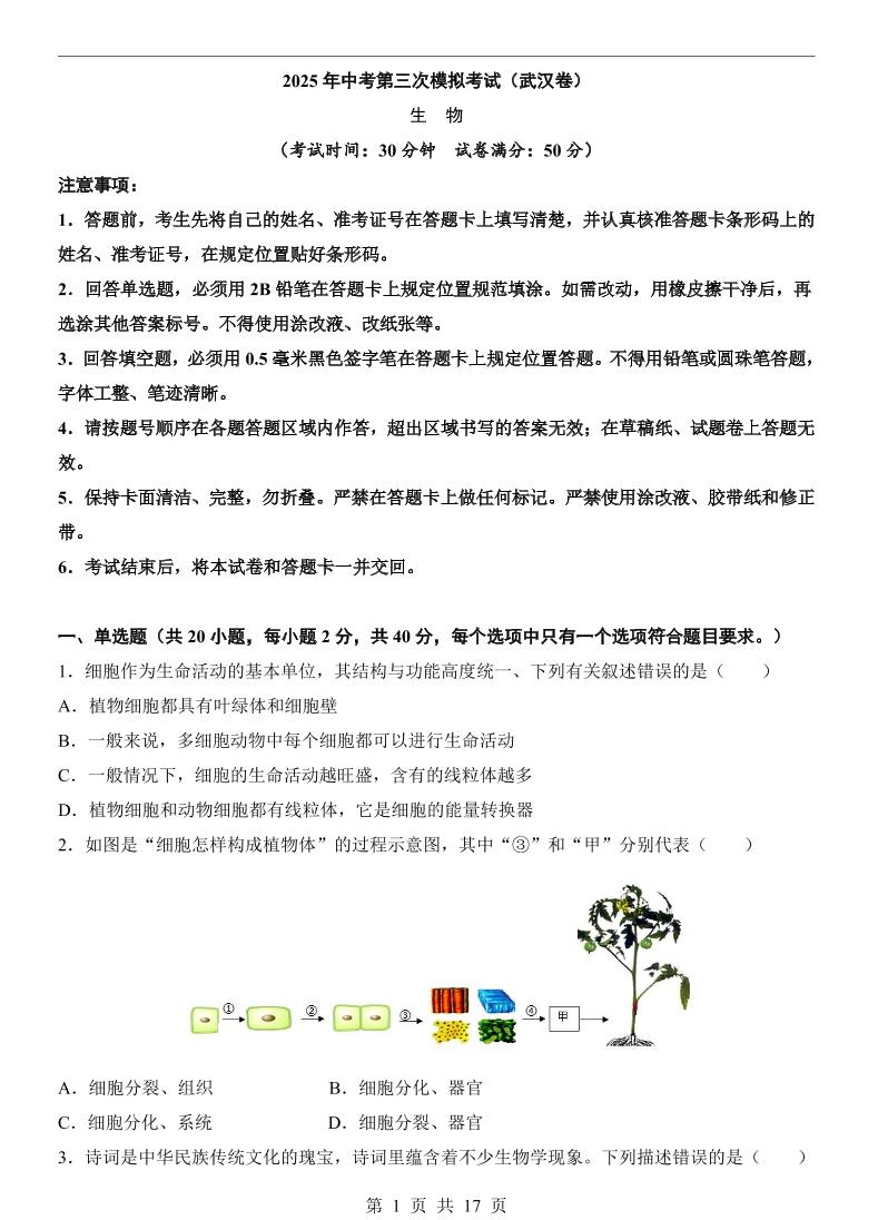 (广东卷)2025年生物中考第一次模拟试卷(考试版A4)_