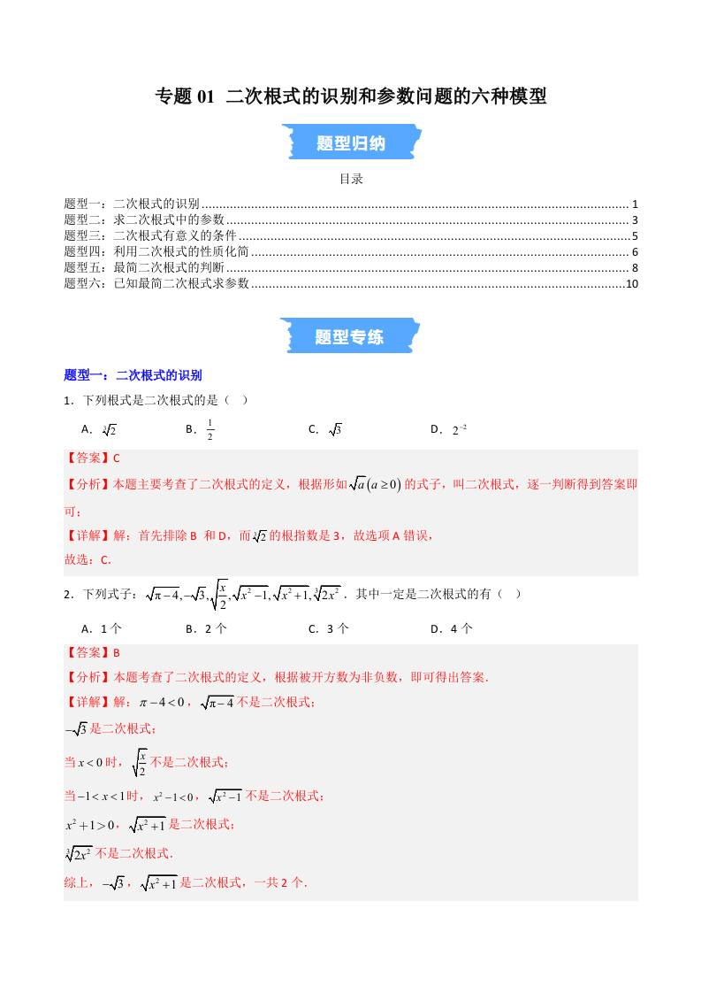 专题01 二次根式的识别和参数问题的六种模型(高效培优专项训练)(学生版)