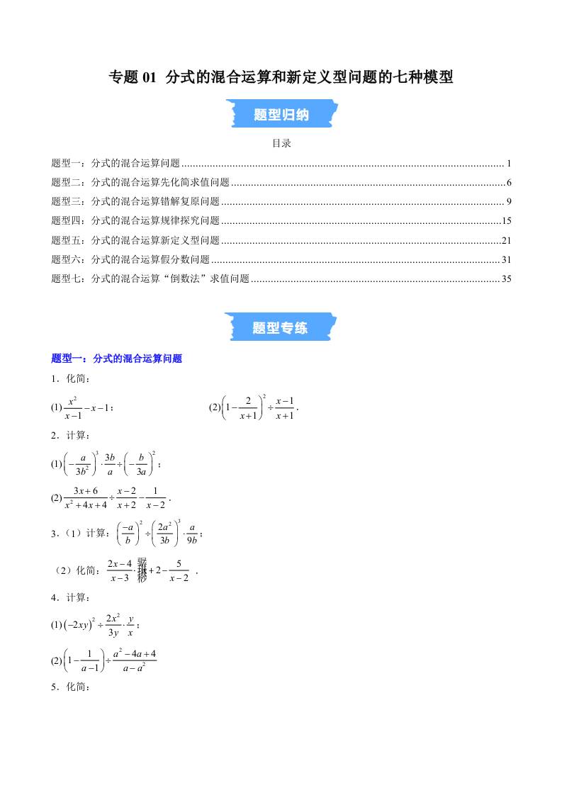专题01 分式的混合运算和新定义型问题的七种模型(高效培优专项训练)(学生版)