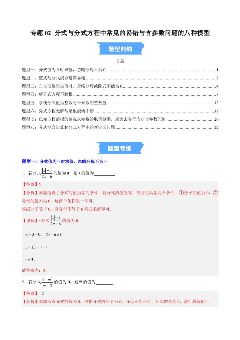 专题02 分式与分式方程中常见的易错与含参数问题的八种模型(高效培优专项训练)(教师版)