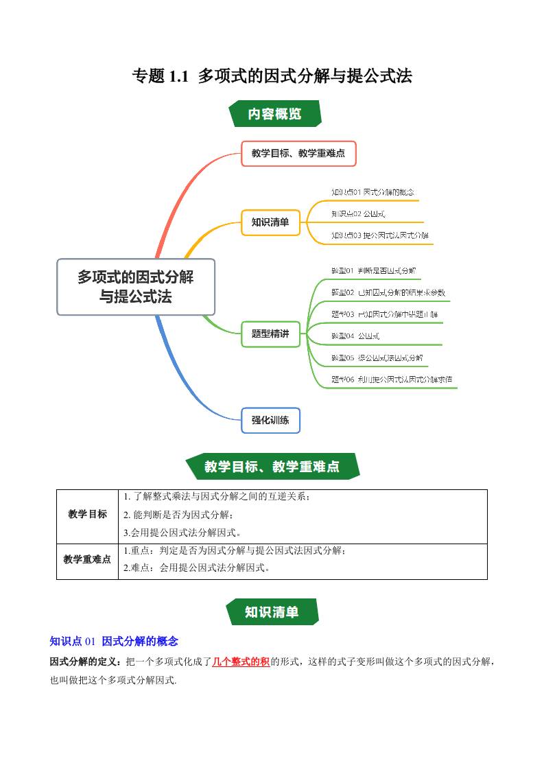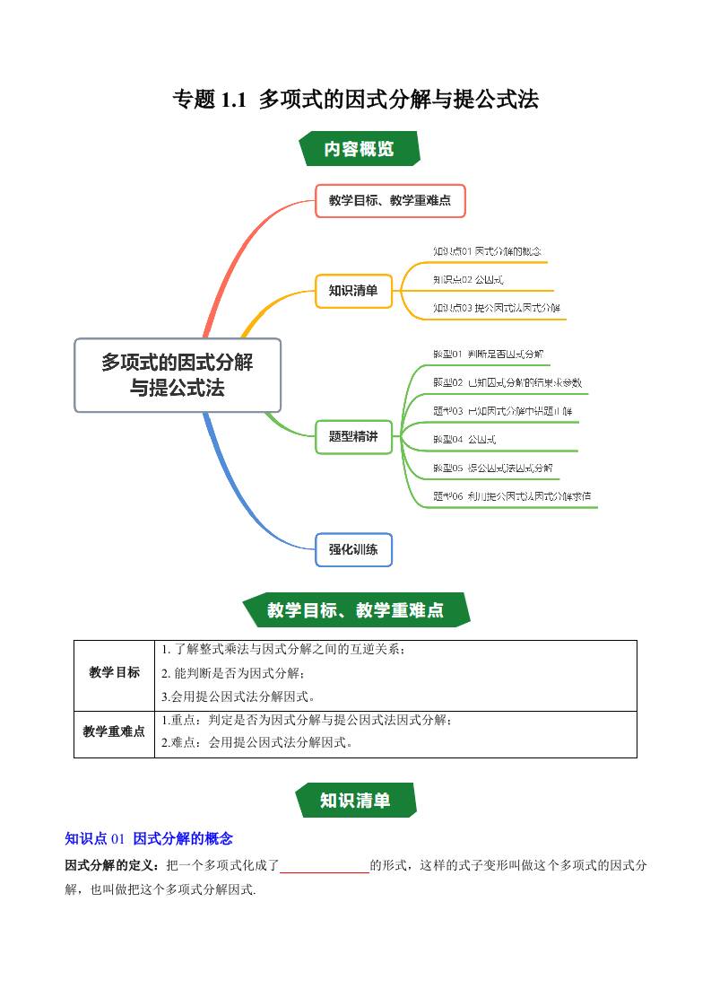 专题1.1 多项式的因式分解与提公式法(高效培优讲义)(学生版)