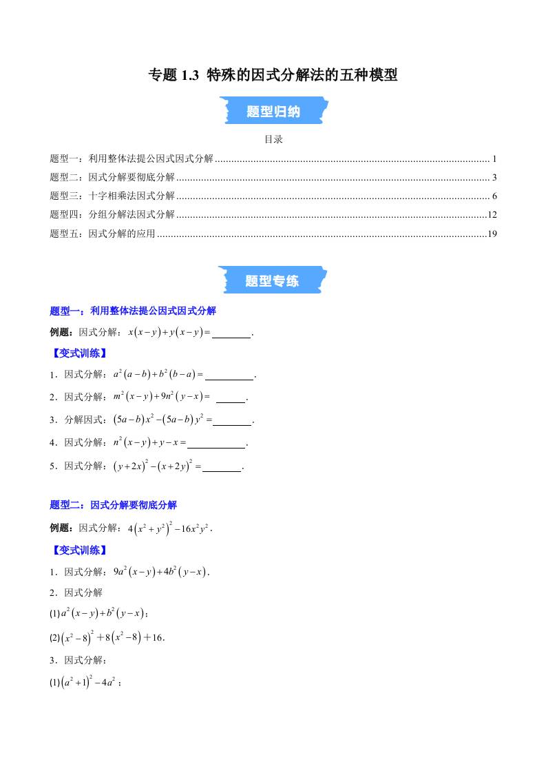 专题1.3 特殊的因式分解法的五种模型(高效培优专项训练)(学生版)