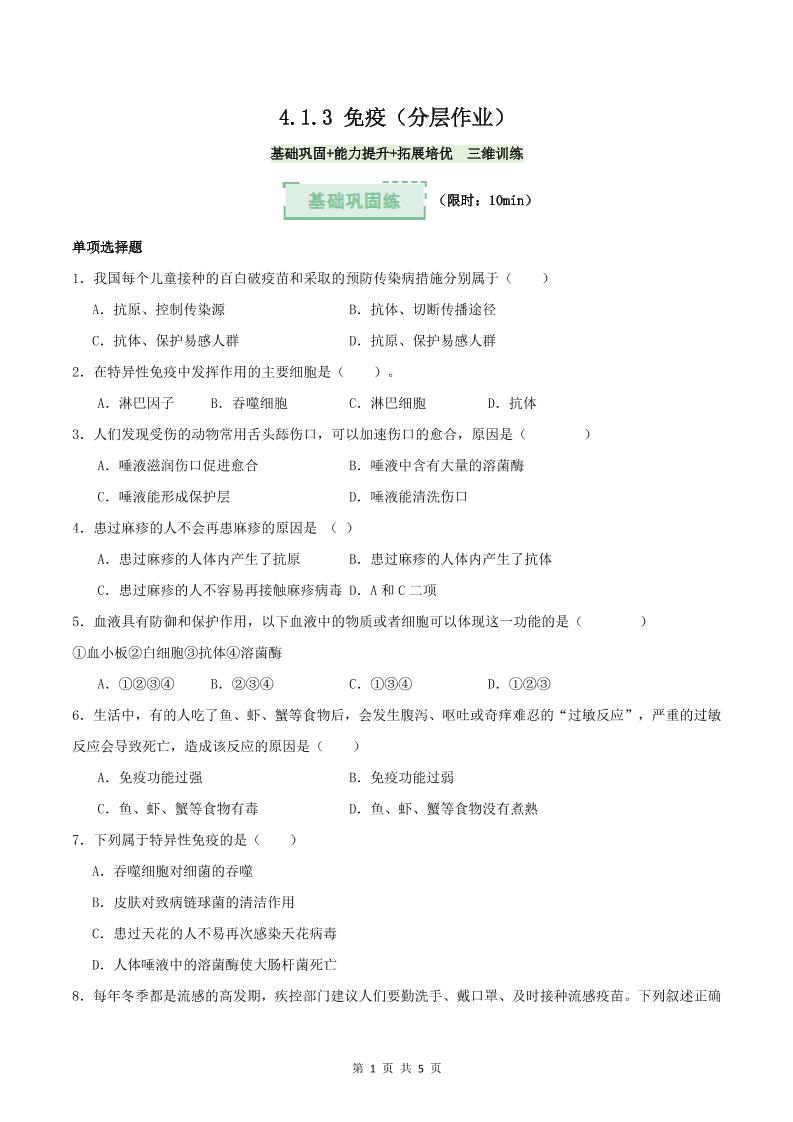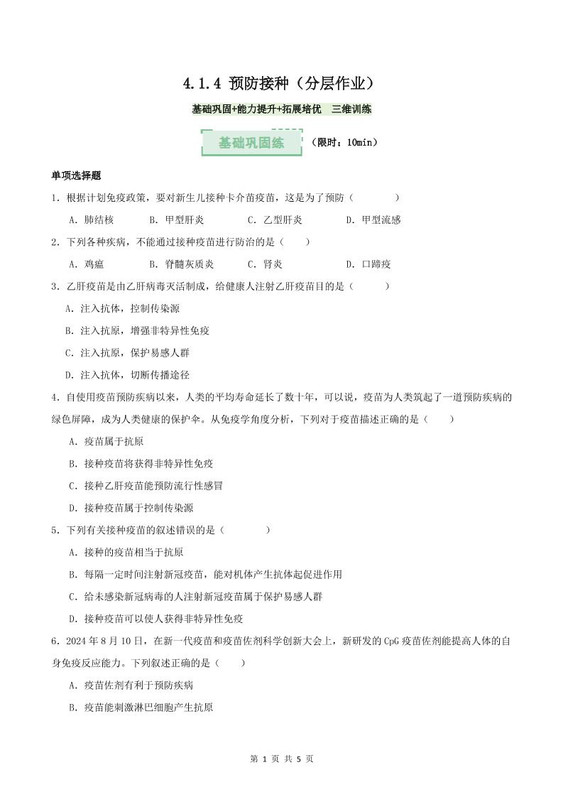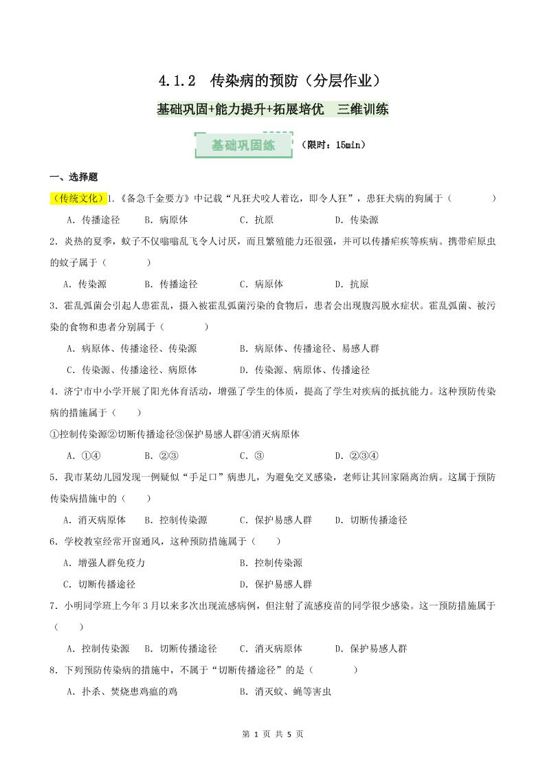 4.1.2 传染病的预防 (分层作业)(原卷版)