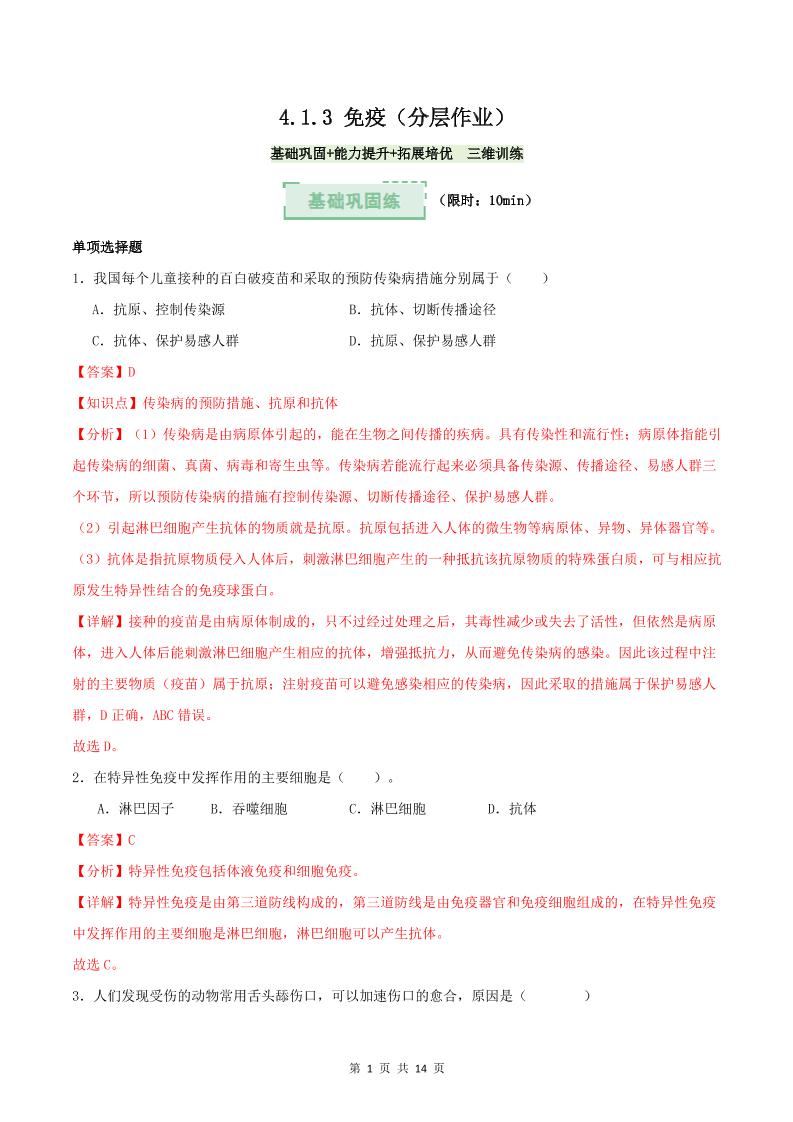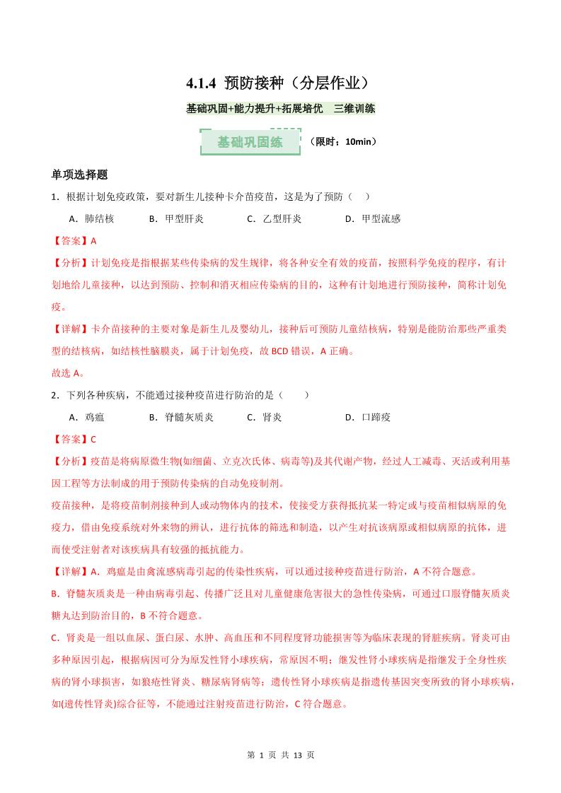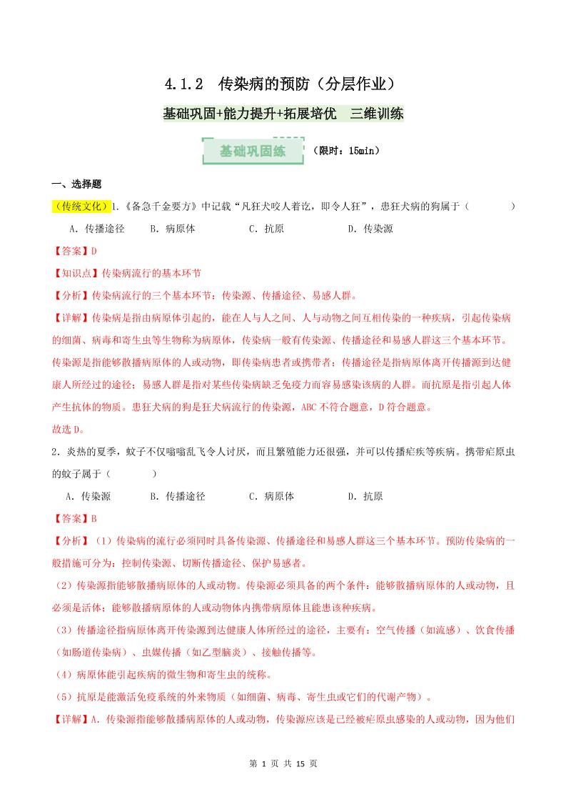 4.1.2 传染病的预防 (分层作业)(解析版)