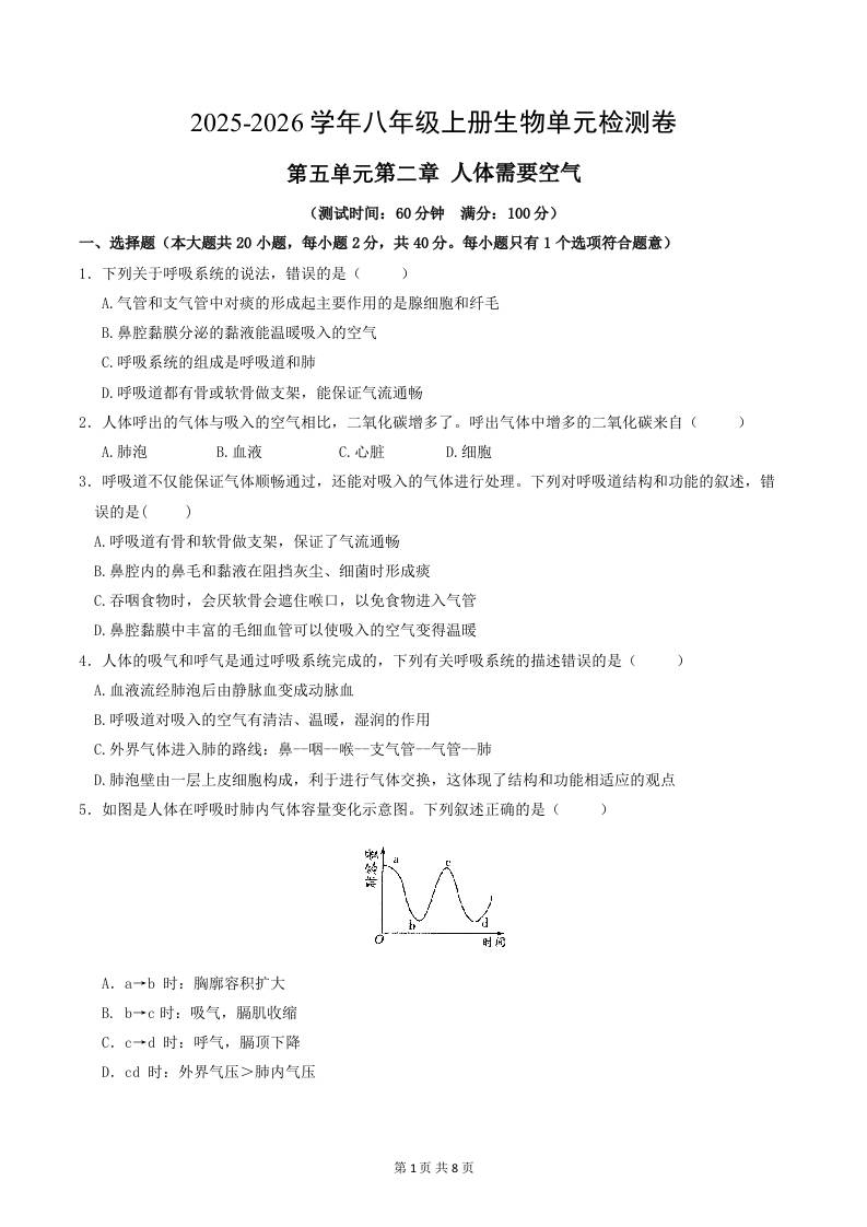 第5单元第2章 人体需要空气(单元测试)(考试版A4)
