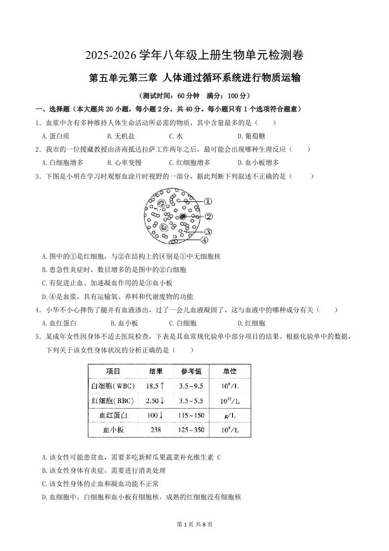 第5单元第3章 人体通过循环系统进行物质运输(单元测试)(考试版A4)