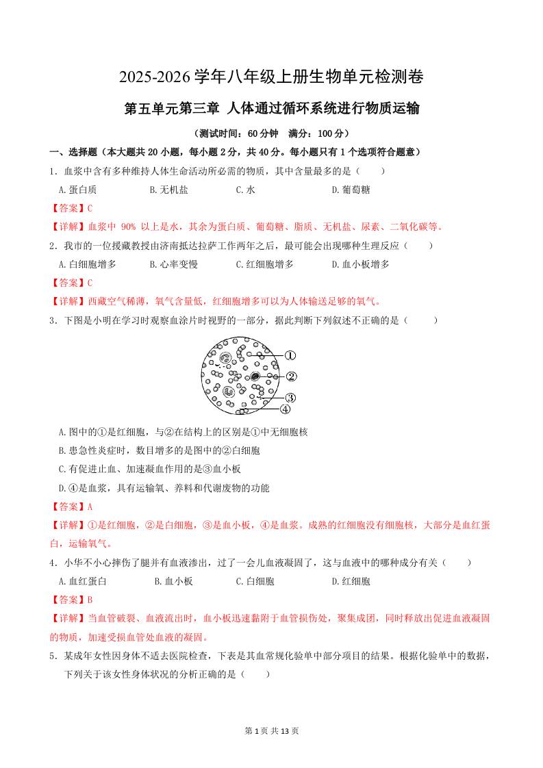 第5单元第3章 人体通过循环系统进行物质运输(单元测试)(解析版)