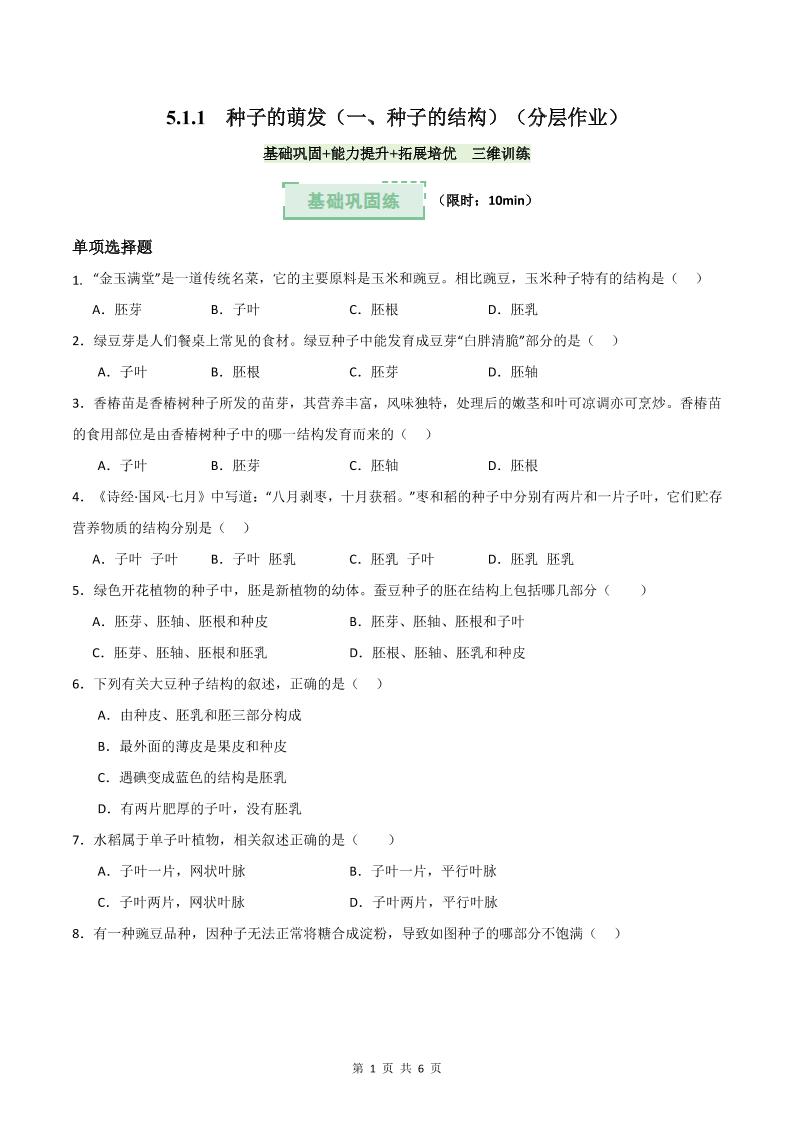 5.1.1 种子的萌发(一、种子的结构)(分层作业)(原卷版)
