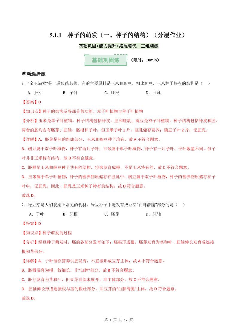 5.1.1 种子的萌发(一、种子的结构)(分层作业)(解析版)