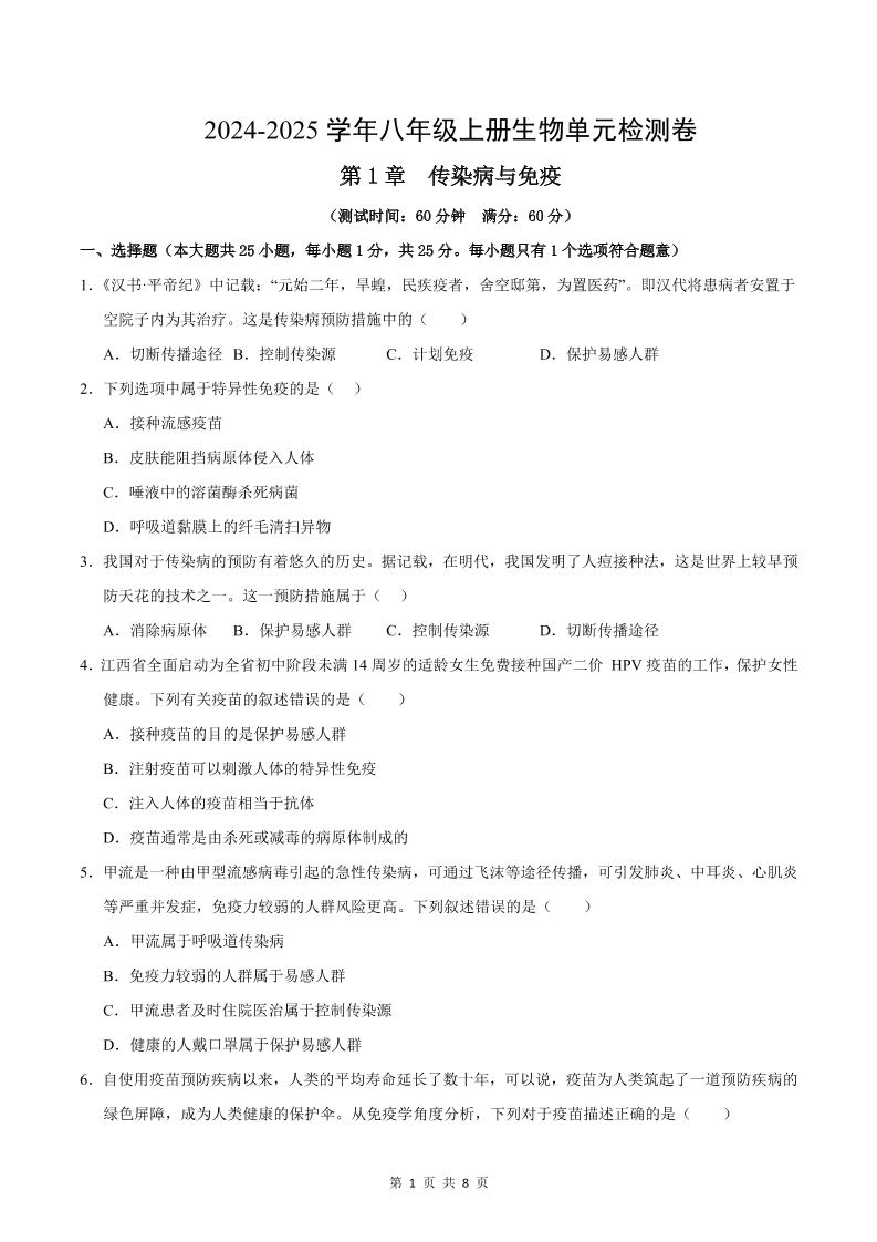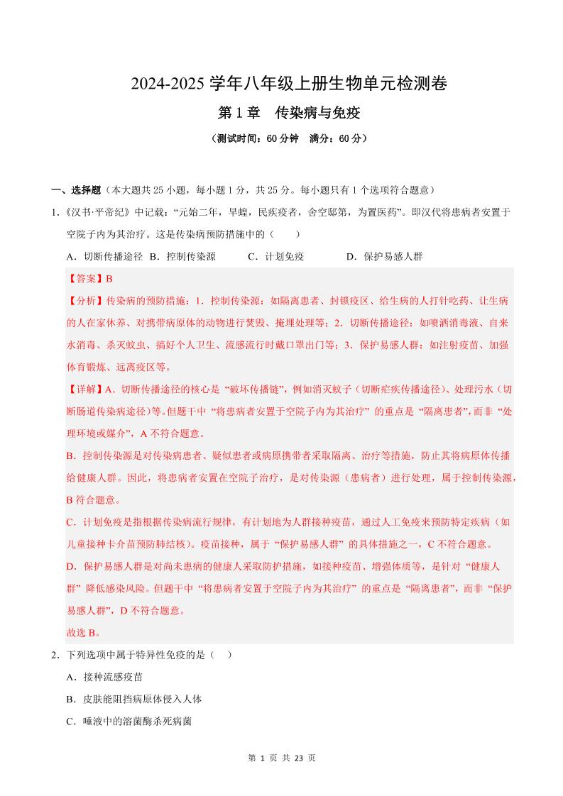 第4单元第1章 传染病与免疫(单元测试)(考试版A4)