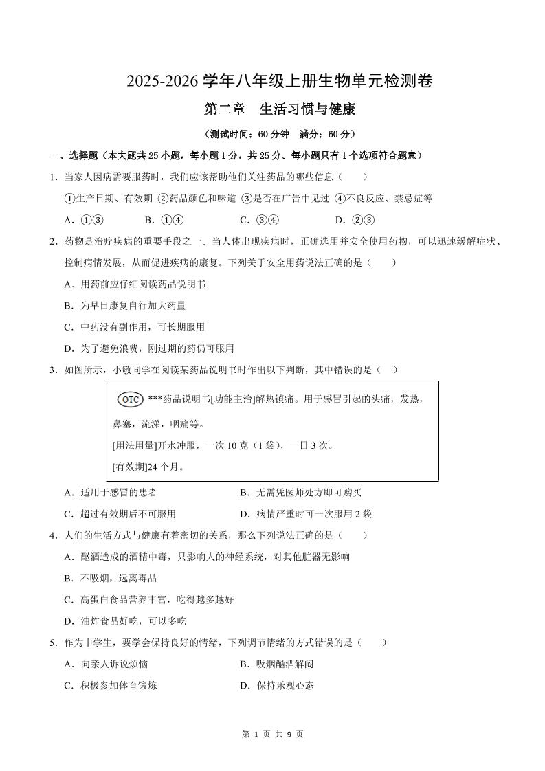 第4单元第2章 生活习惯与健康(单元测试)(考试版A4)