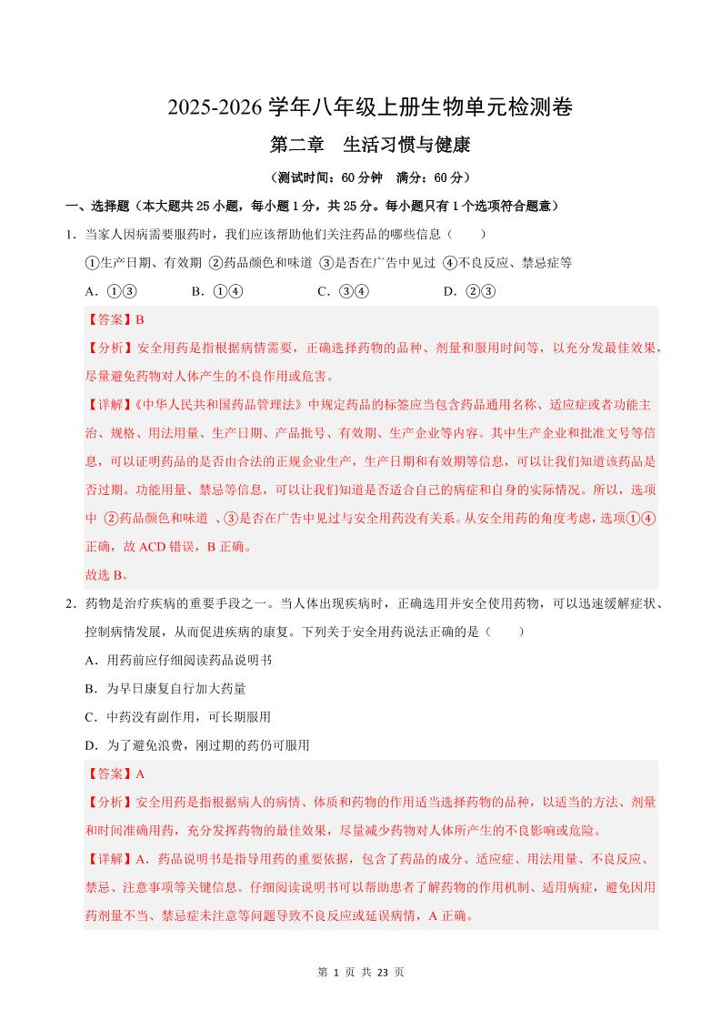 八年级生物第一次月考卷(全解全析)(冀少版2024)02