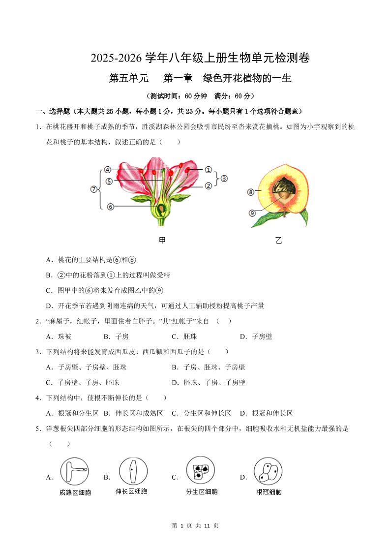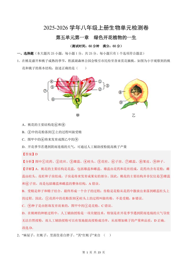 第5单元第1章 绿色开花植物的一生(考试版A4)