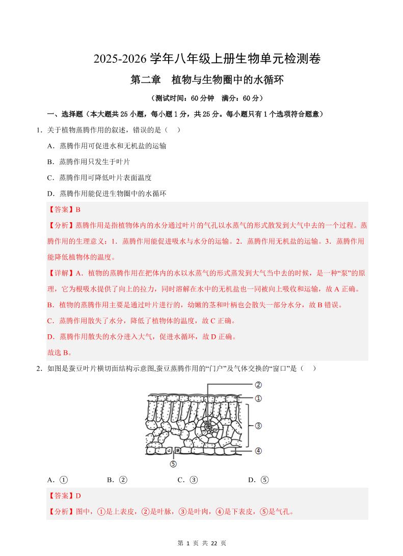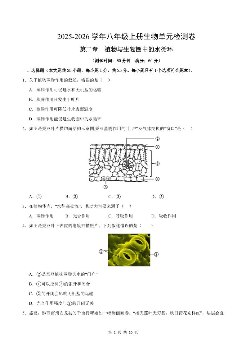 第5单元第2章 植物与生物圈中的水循环(考试版A4)