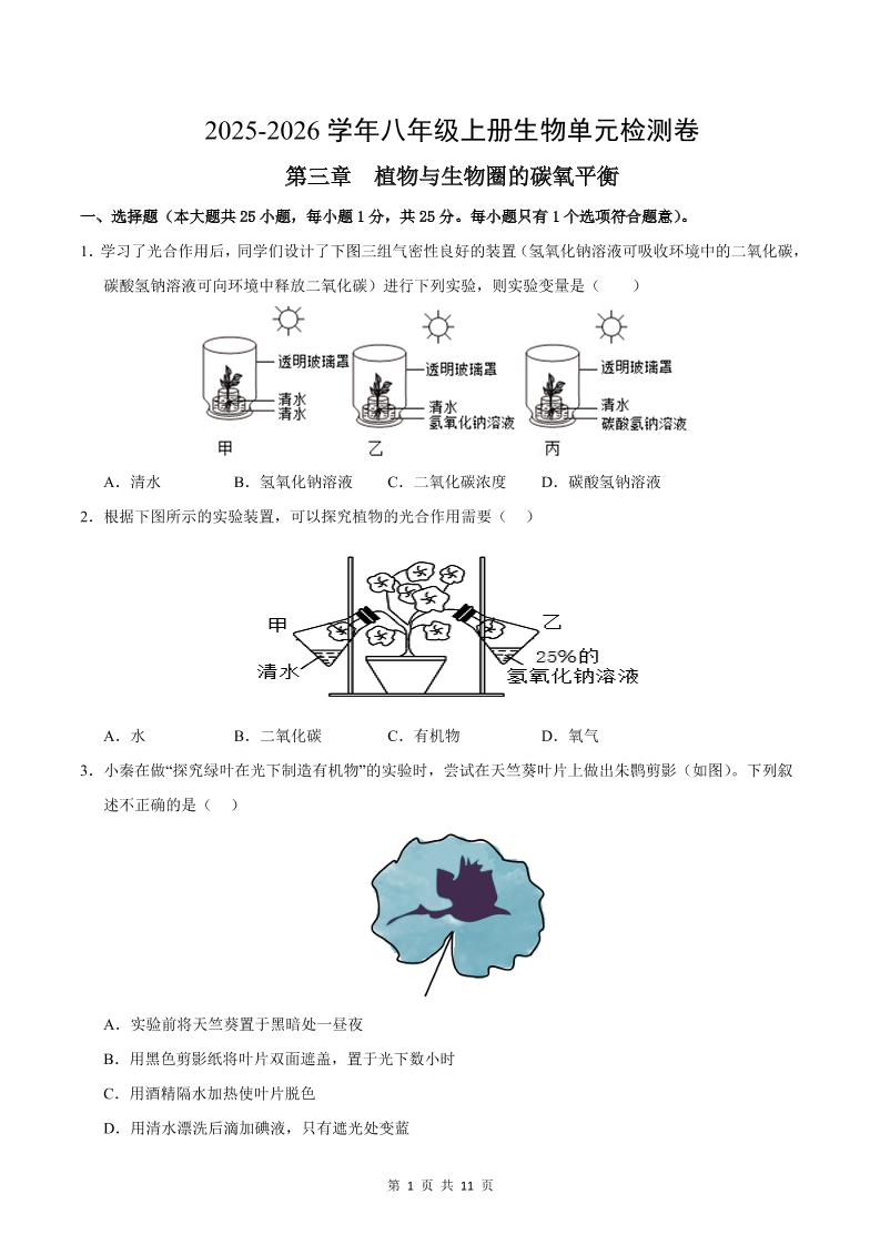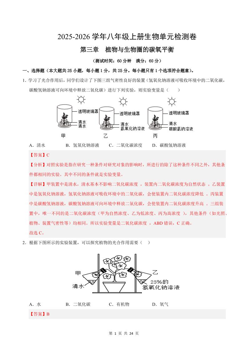 第5单元第3章 植物与生物圈的碳氧平衡(考试版A4)