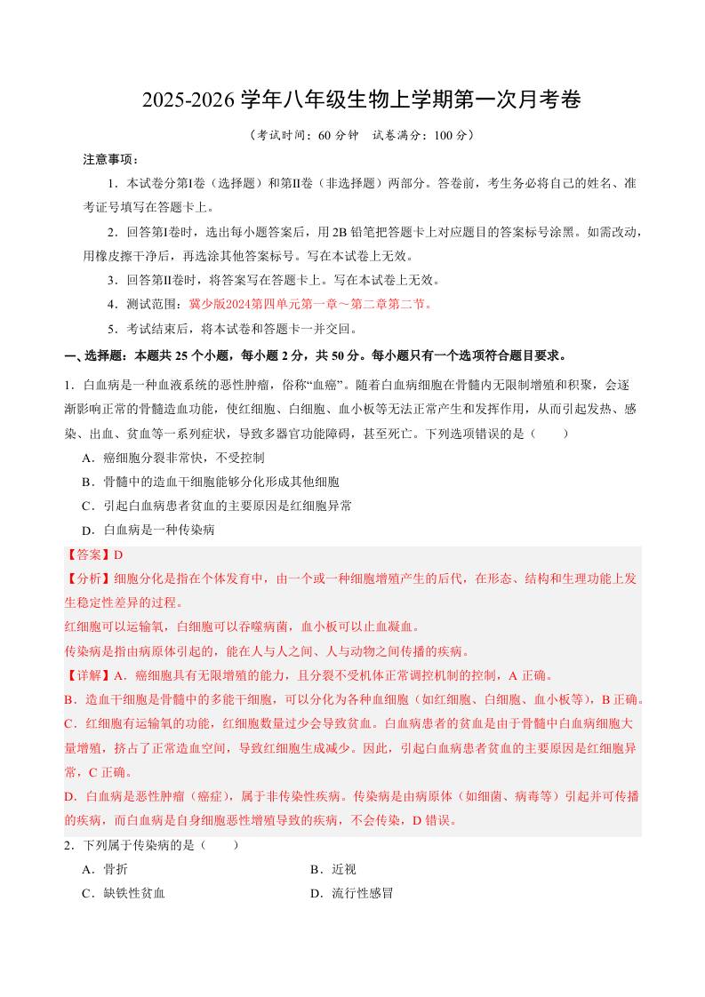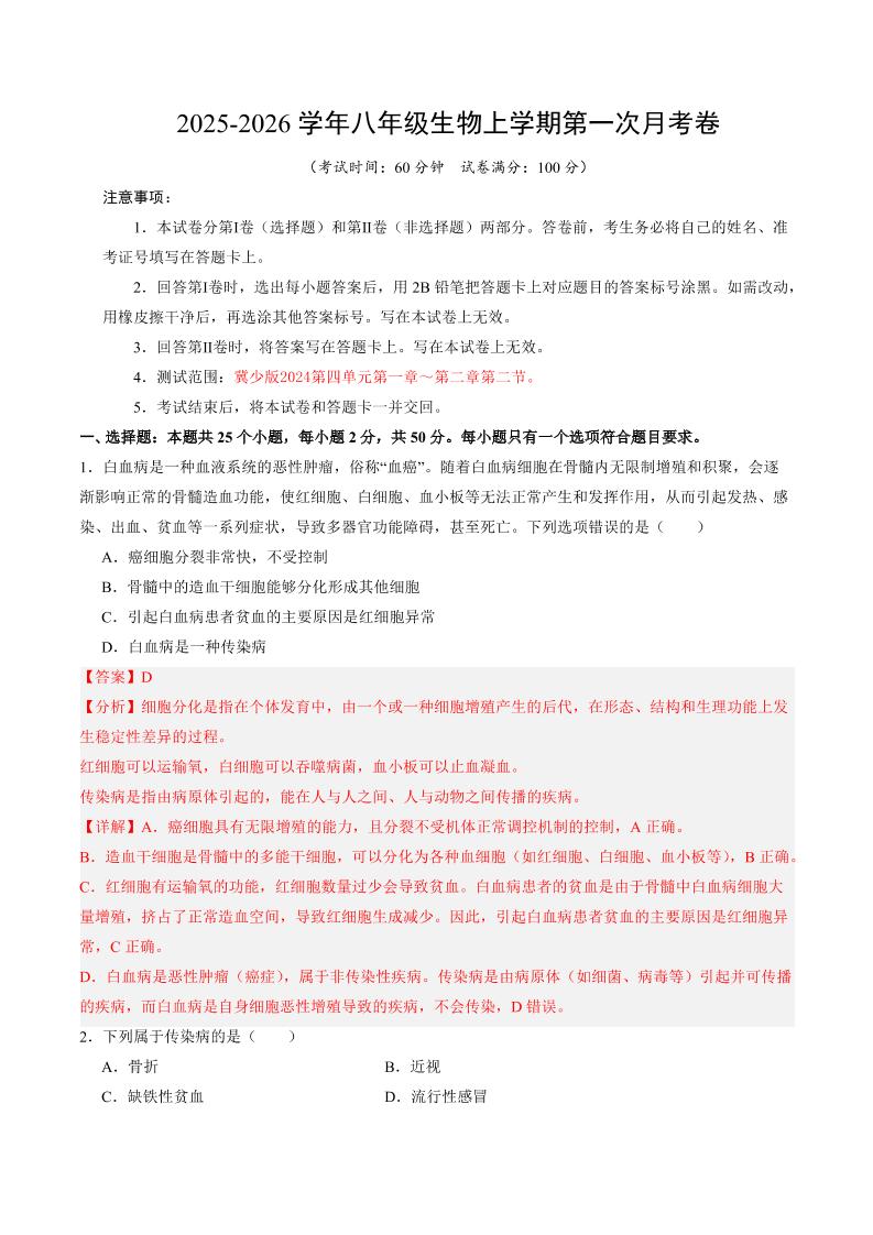 八年级生物第一次月考卷【测试范围:冀少版2024第一单元第一章~第二章第二节】(考试版)